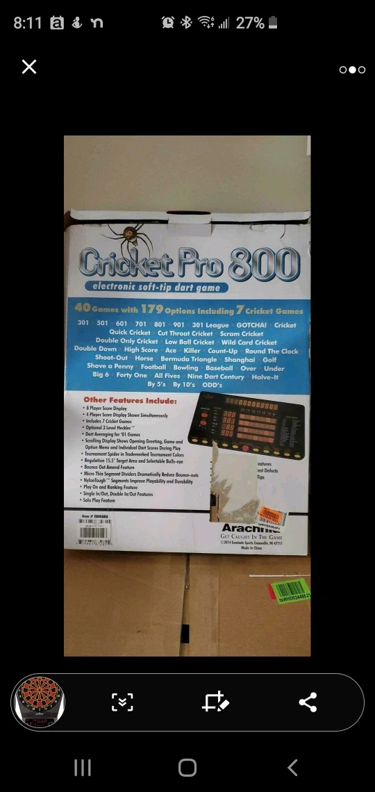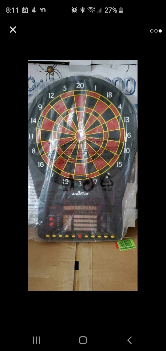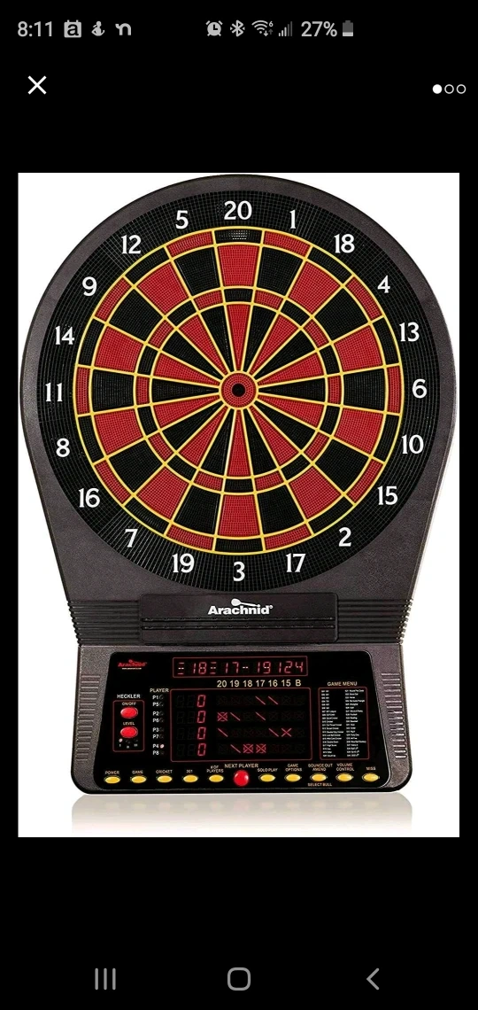 444Brand new in the box except missing a few soft tip darts. prices accordingly.... retails for $410 + taxes Electronic dart game with multiple game options. Tournament-Quality electronic dartboard-regulation 15.5" Target area 39 games with 179 variations (7 cricket games) Nylontough segments improve durability and playability Micro-Thin segment dividers dramatically reduce bounce-outs Optional 3 level heckler feature for interactive play