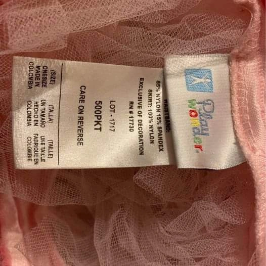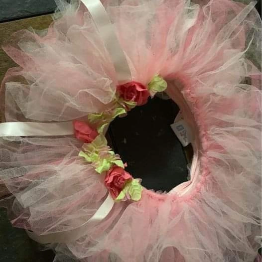Adorable pink tutu with white ribbon and red rose flower embellishments.
