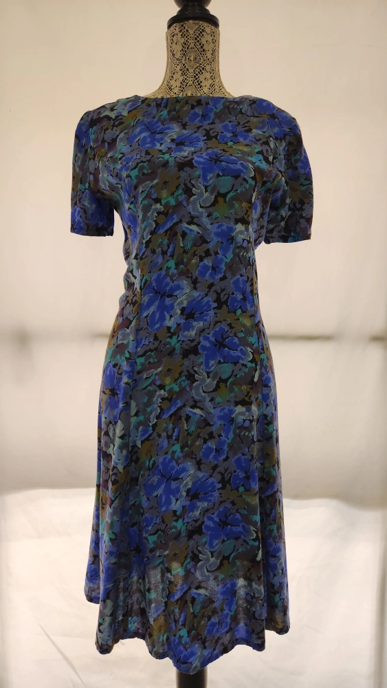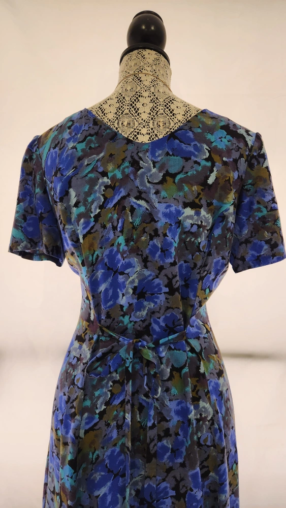 This is a beautiful blue floral print vintage dress with a fitted bodice, light and airy skirt features