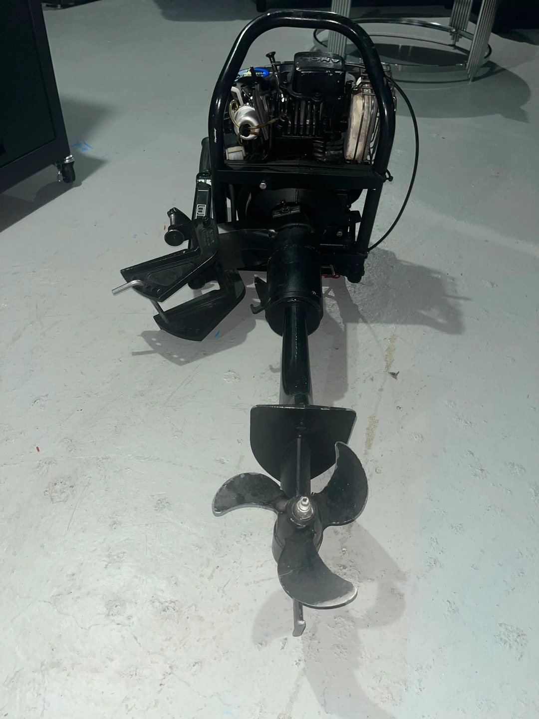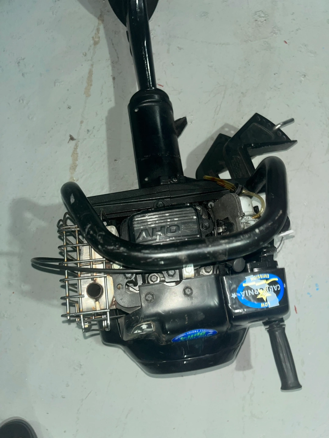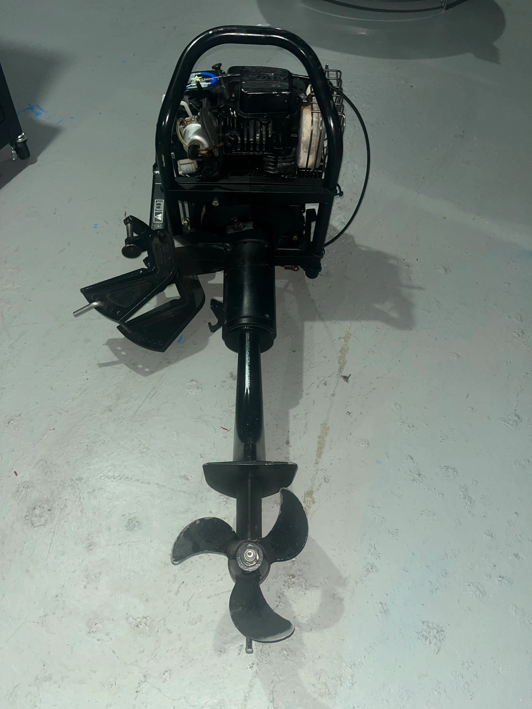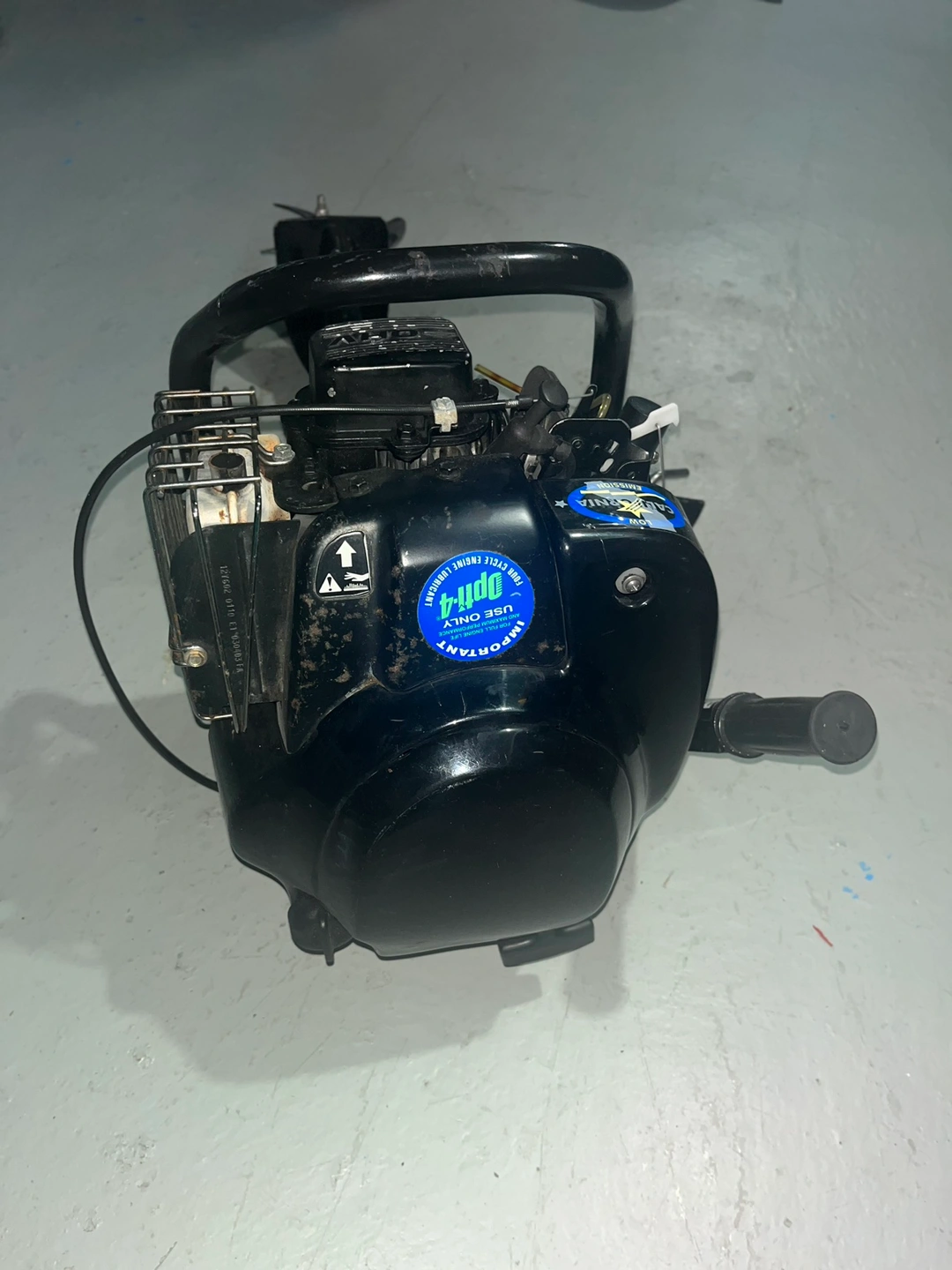 This is a outboard motor, great for small boats and dinghies. Comes with a tiller handle, and a propeller. This motor has a pull start system.