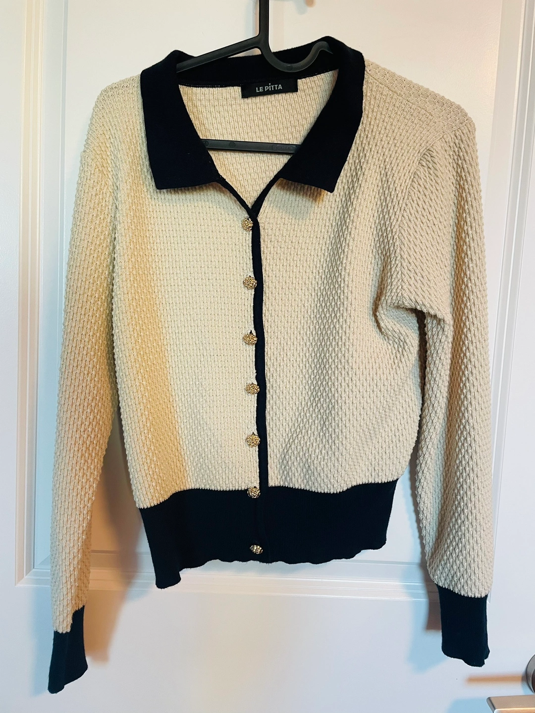 A cream cardigan with black trim and gold buttons. It features a collared neckline and long sleeves. Not cheap looking. It is in great condition. Fits like small-medium. Got it from korea for $70. No Try ons 🙏🏻