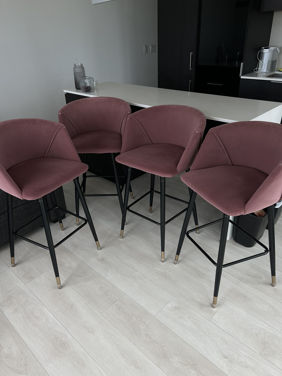 Set of four luxury bar stools with black legs and gold accents. They are in good condition. Wayfair brand.