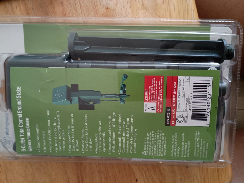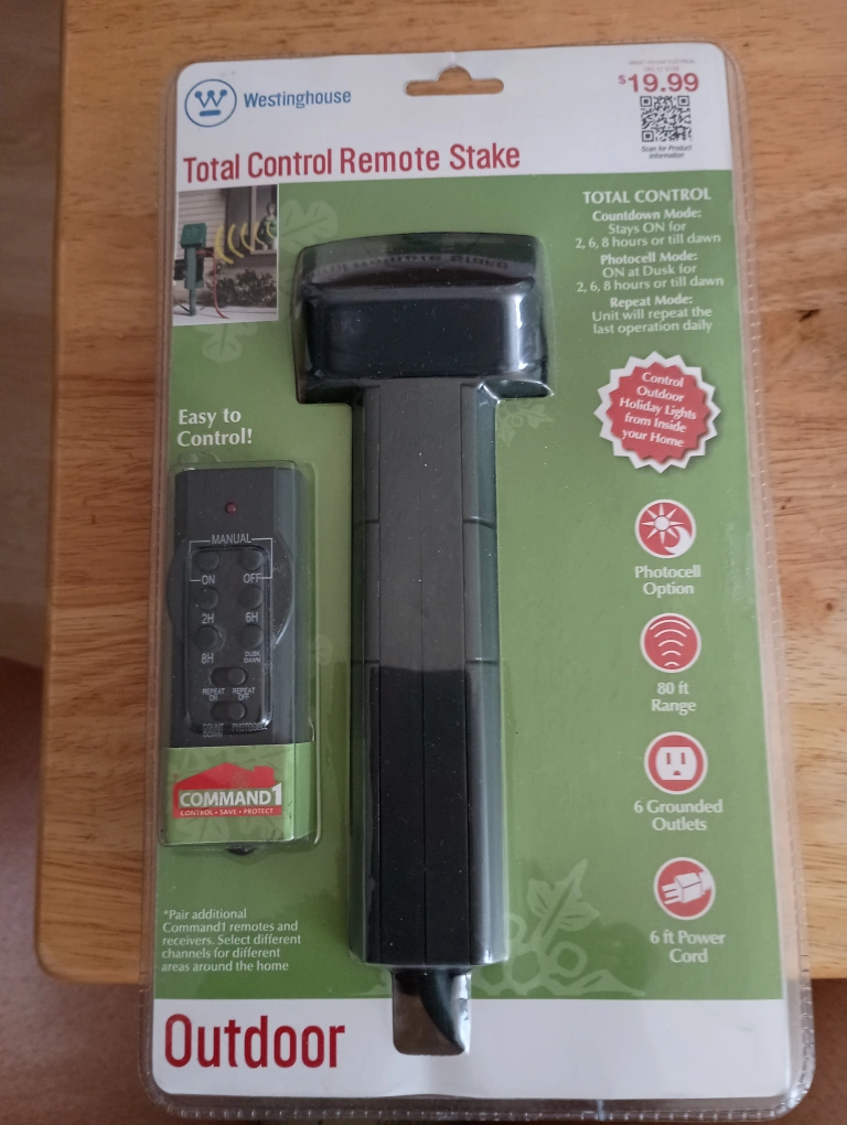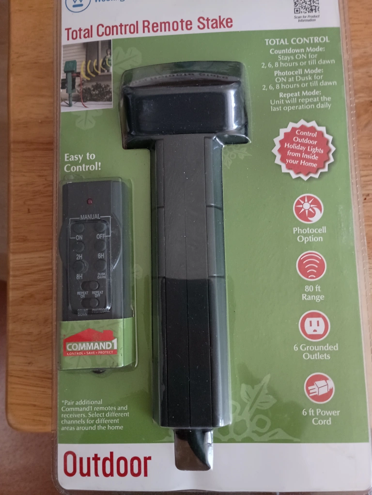 This is a brand new, never used, outdoor stake that can control outdoor holiday lights from inside your home. It has photocell option, 80 ft. range, grounded outlets, and 6 ft. power cord.