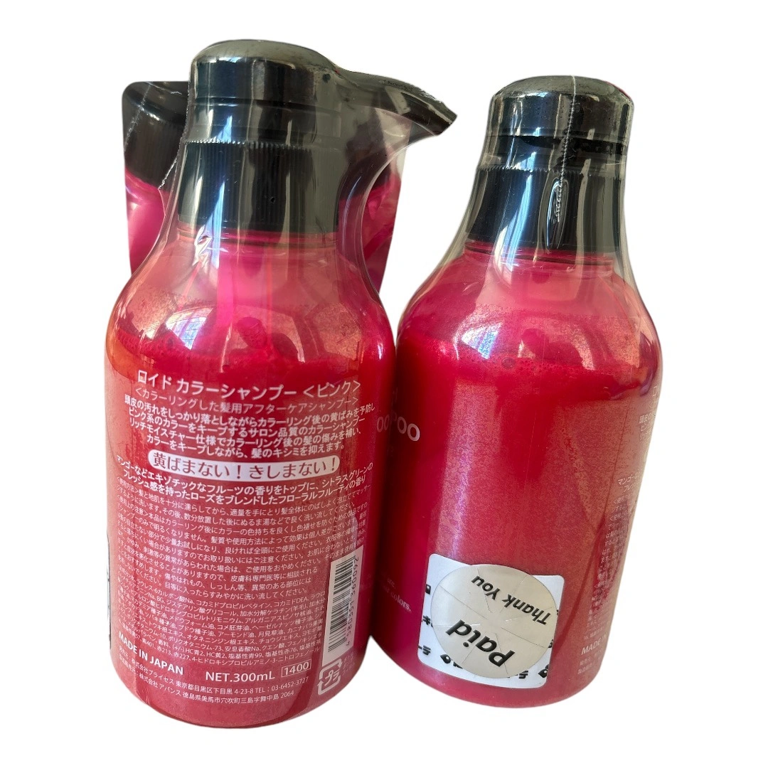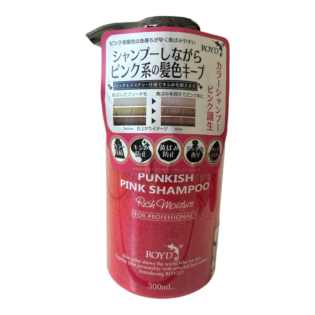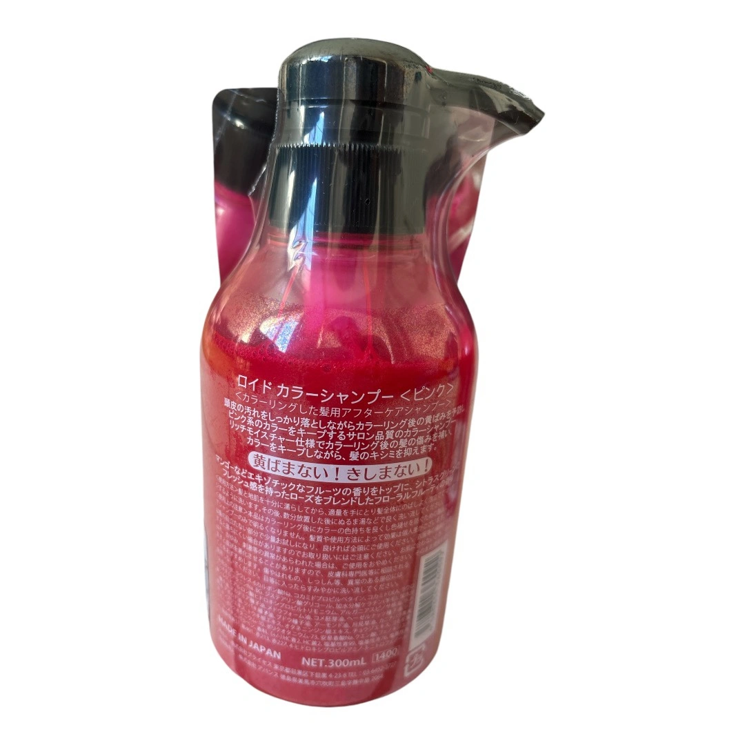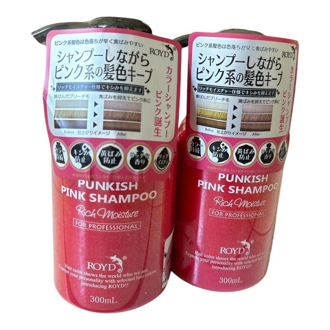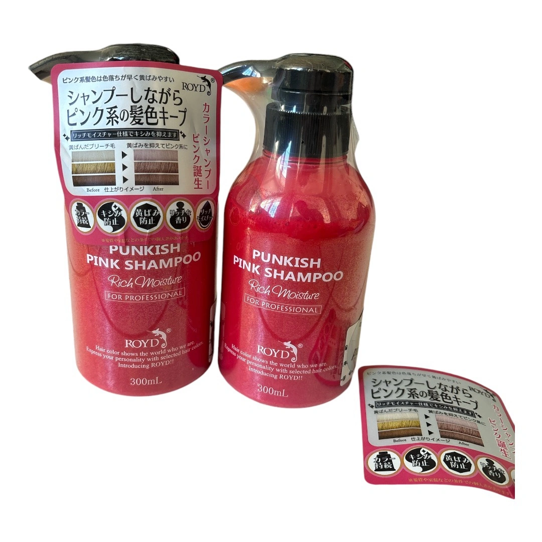 Two bottles of ROYD Punkish Pink Shampoo - Rich Moisture for Professional use. Each bottle is 300 ml. Keep your brown, red, pink tone hair colour. Purchased from Don Quijote Tokyo.