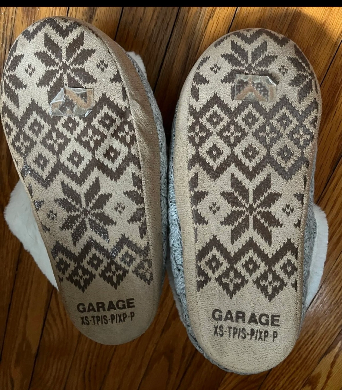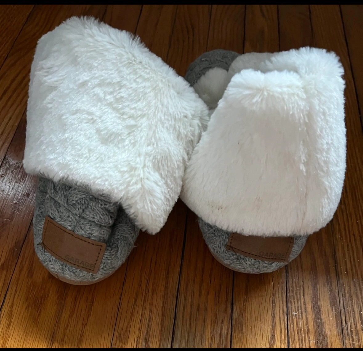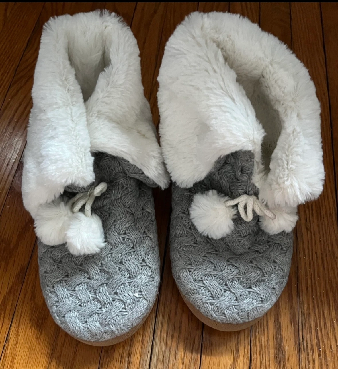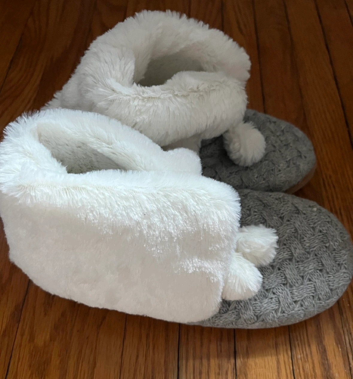 Grey knitted slippers with a fold over white faux fur cuff and pom pom detail.Like new.