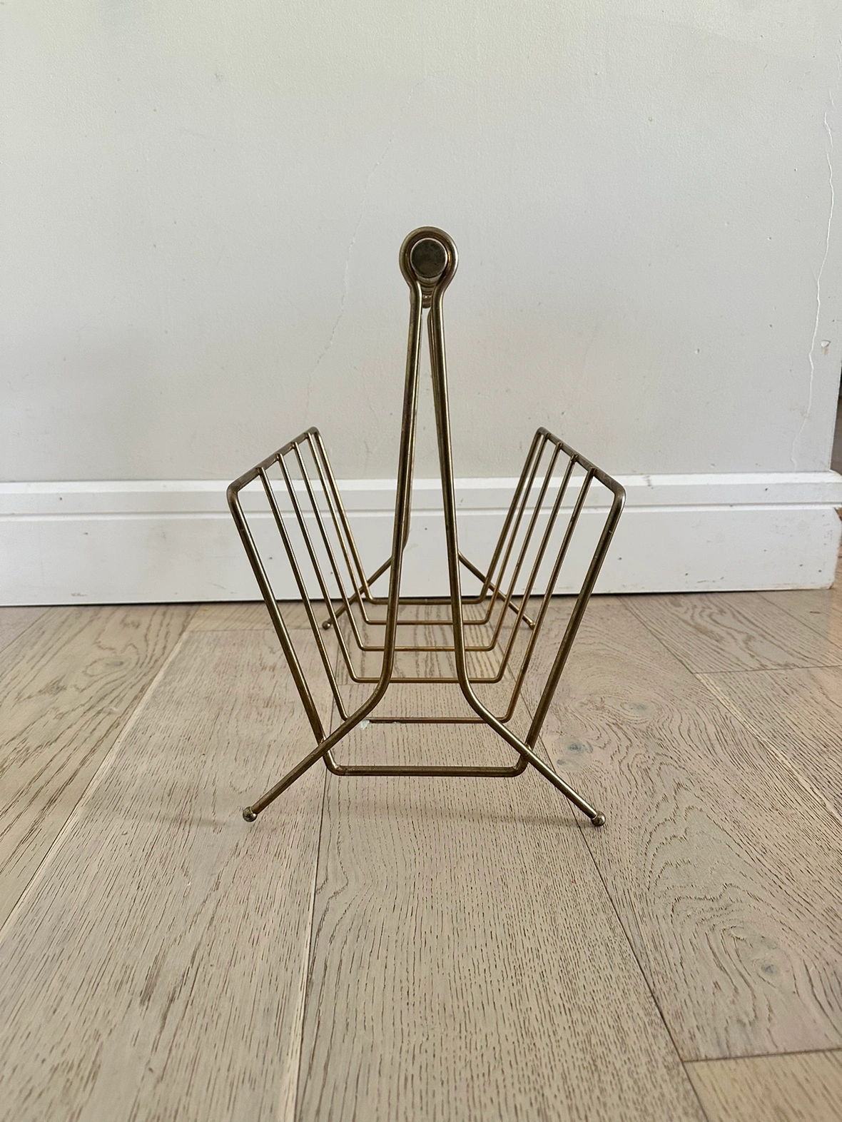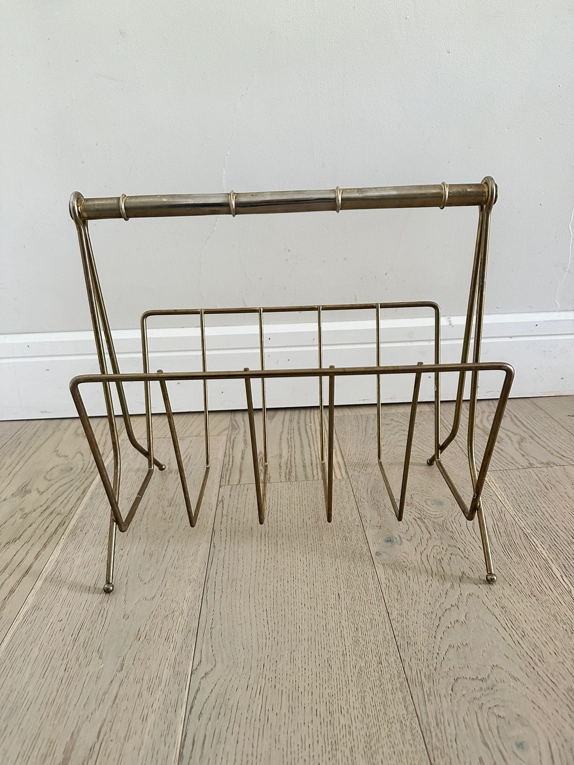Metal magazine rack with a handle for easy carrying. This rack is in good vintage condition and would be a great addition to a home office or living room.