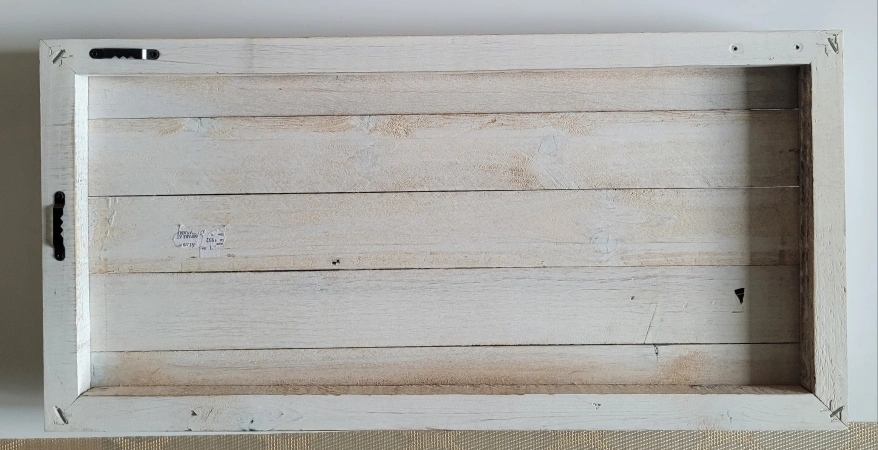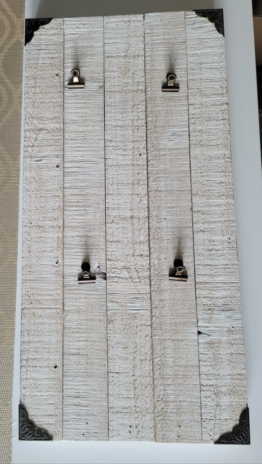 This is a white washed wood picture frame with 4 clips. It is approximately 18 inches tall and 12 inches wide. It would look great in any farmhouse style home.