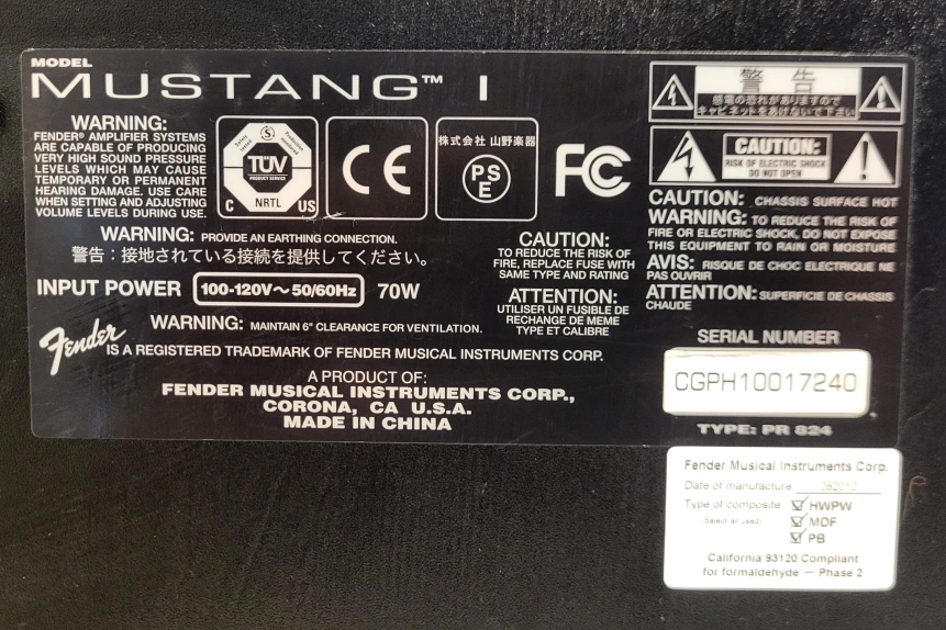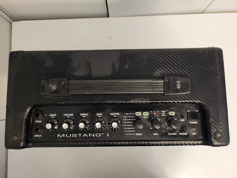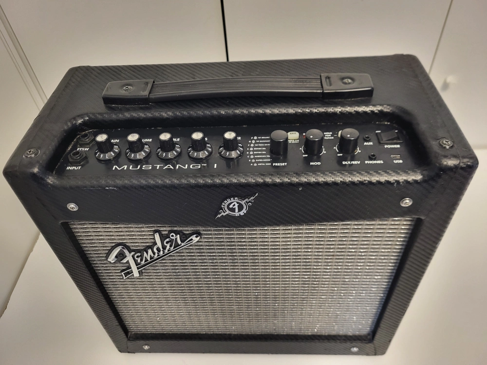 Fender Mustang I Electric Guitar Amplifier. Includes power cord. Good for begginer guitarist. Has built in effects to play around with.