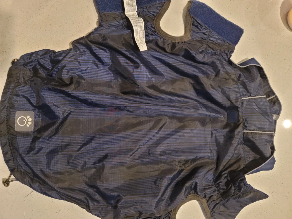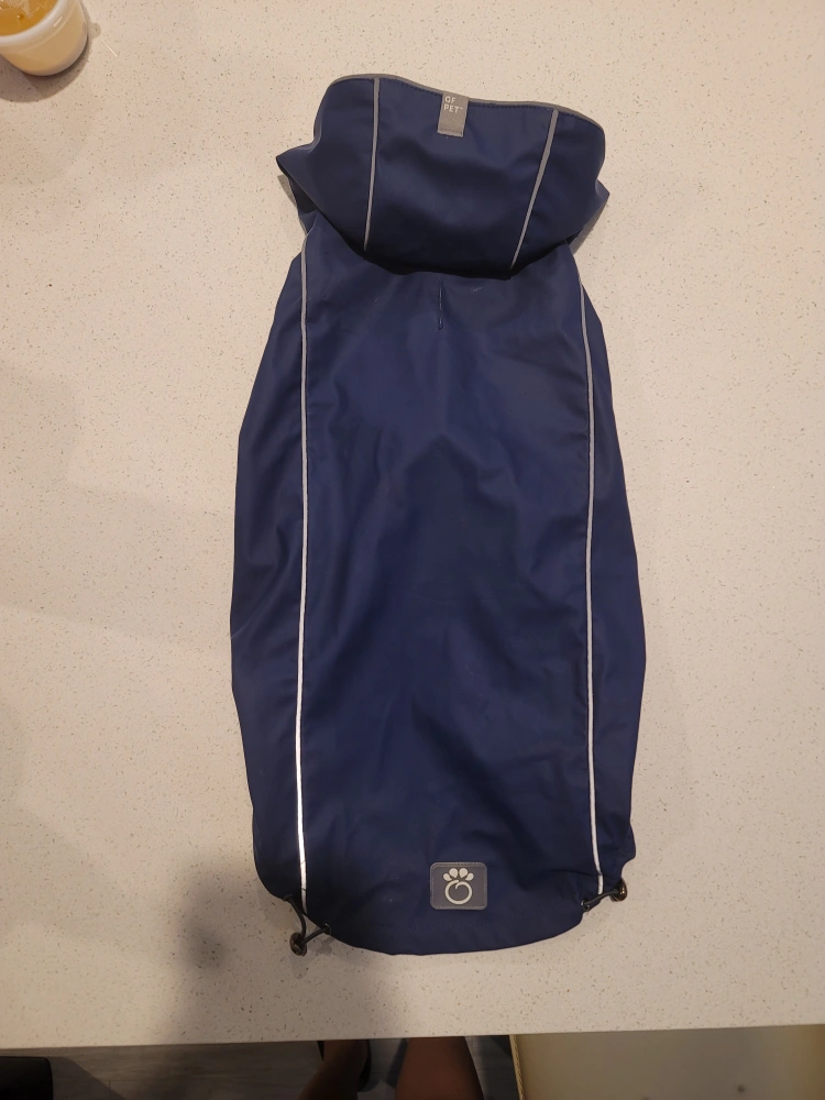 BLUE dog raincoat with reflective strips. It is a hooded jacket and has an adjustable belly strap. The raincoat is made of a waterproof material and is reversible.
