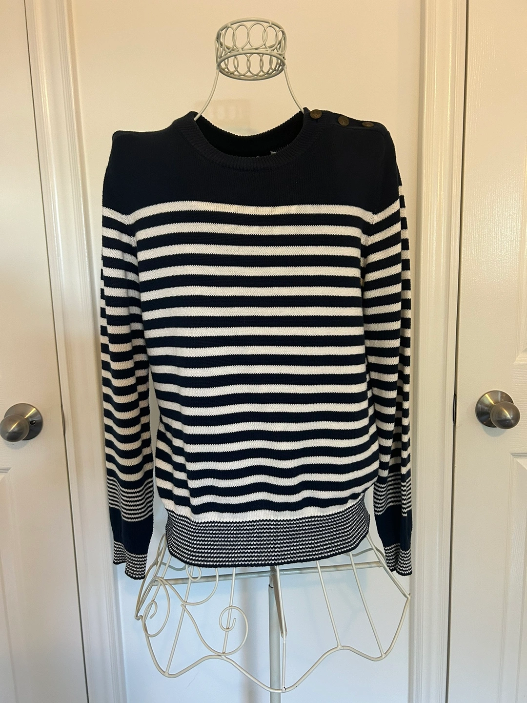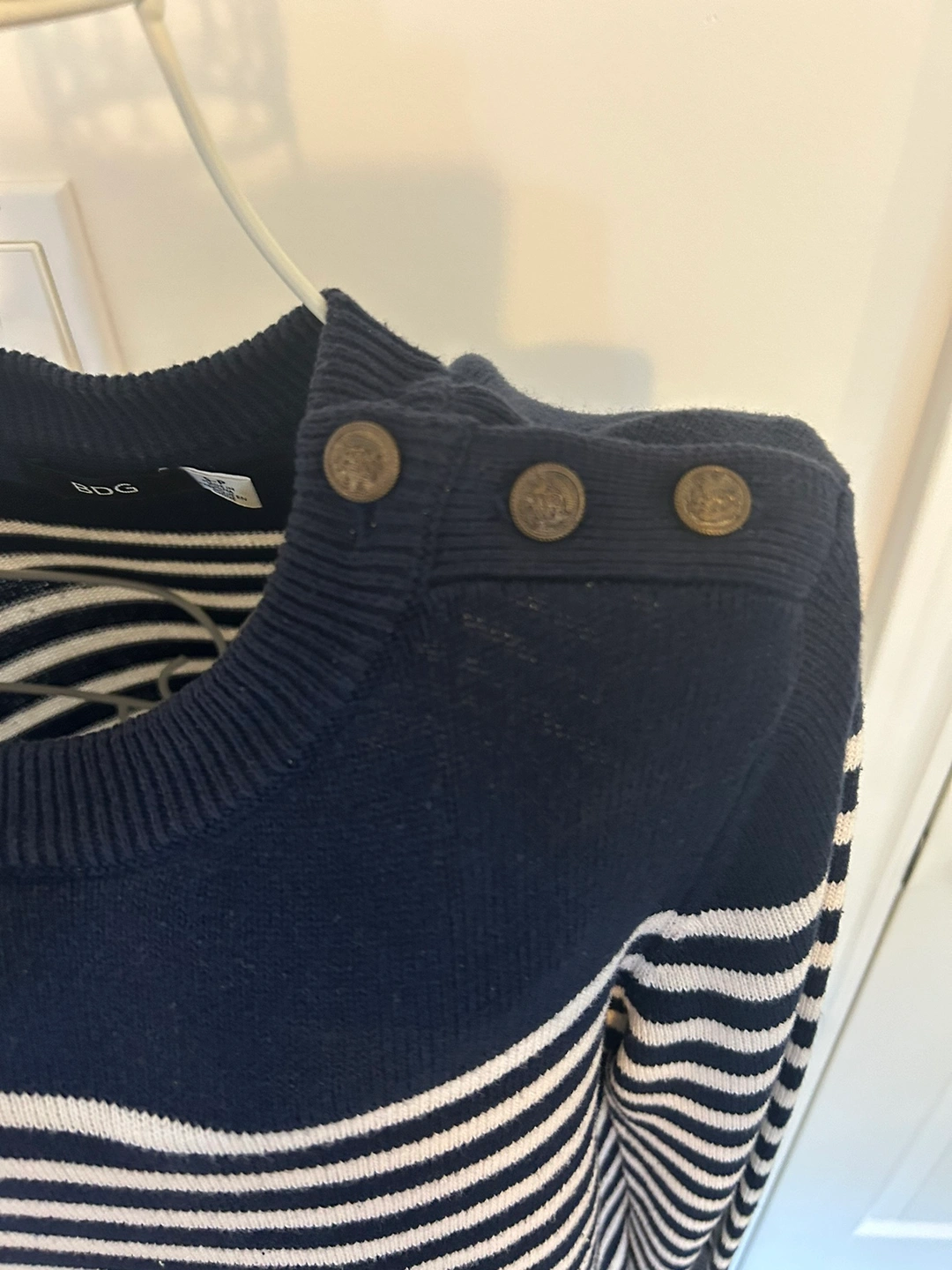 Striped sweater with buttons on the shoulders. Long sleeves. Made of cotton. Size Small. Colour is Navy and White. Made by BDG Urban Outfitters.