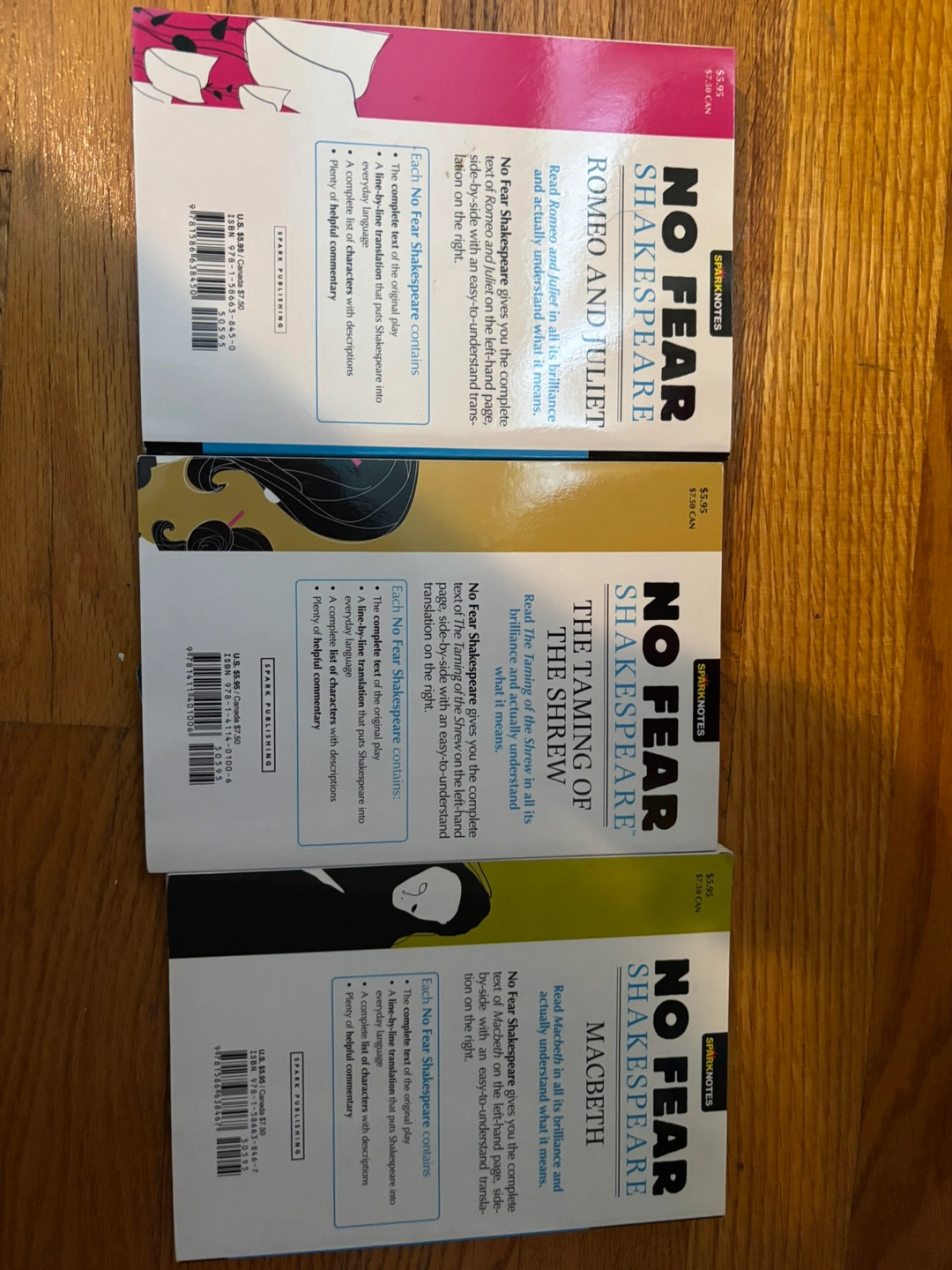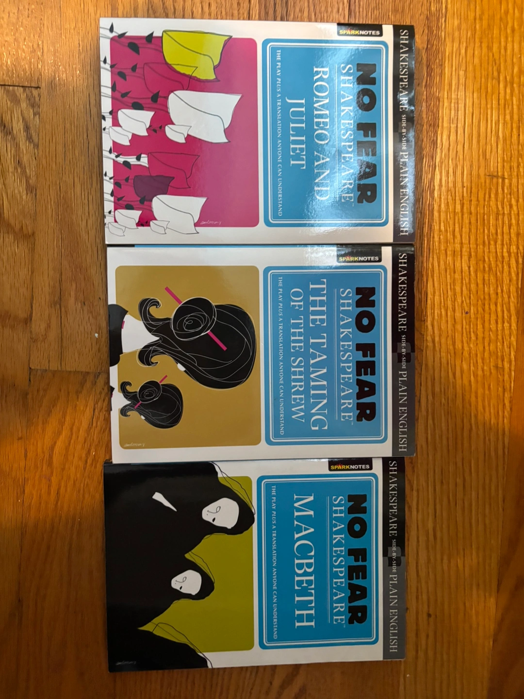 Set of three "No Fear Shakespeare" books: Macbeth, Romeo and Juliet, Taming of the Shrew. Each book includes the original play in Shakespearean English and a modern English translation on the opposite page. great quality. You can buy 1 for $3.5 or 3 for $10.