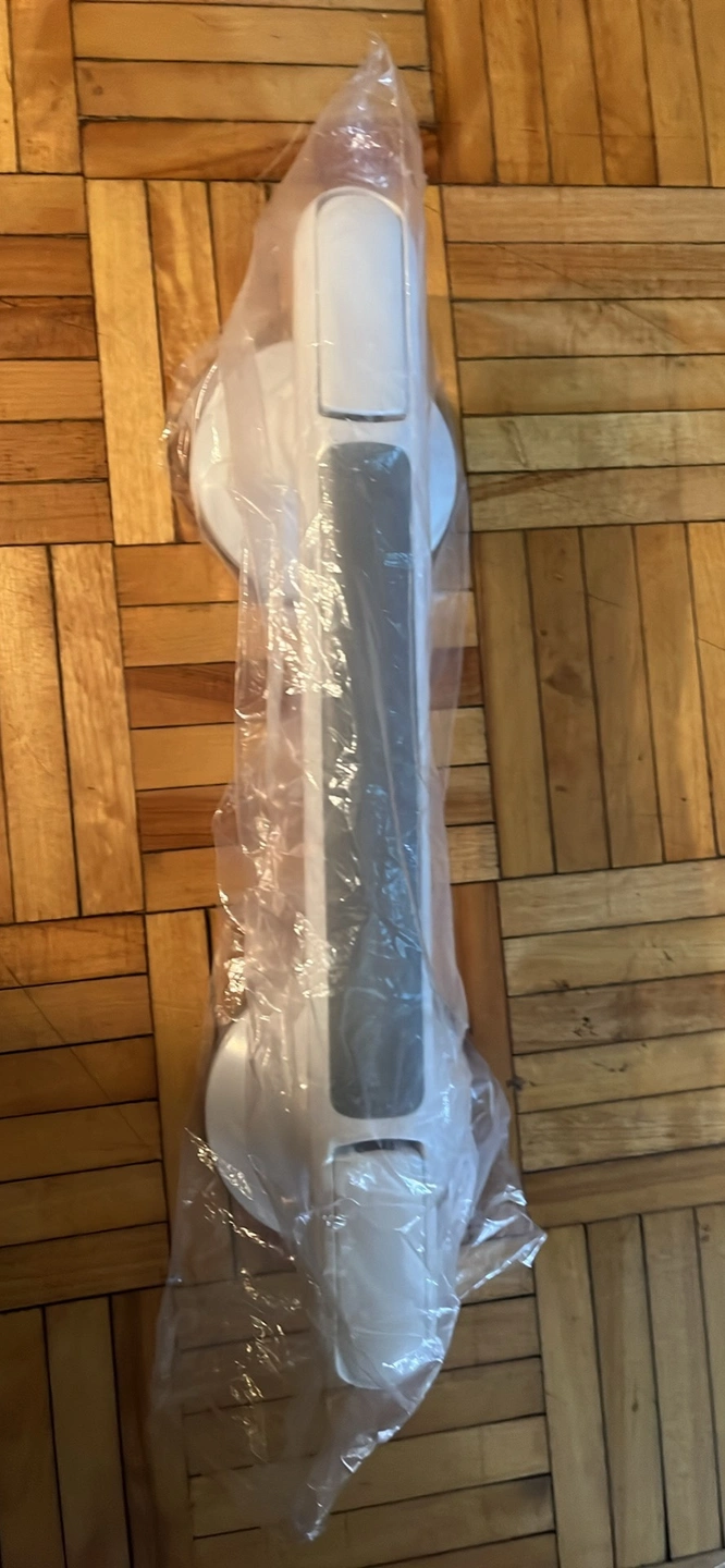 A white safety grab bar for the shower or tub. It has two suction cups. The suction cups appear to be in good condition.