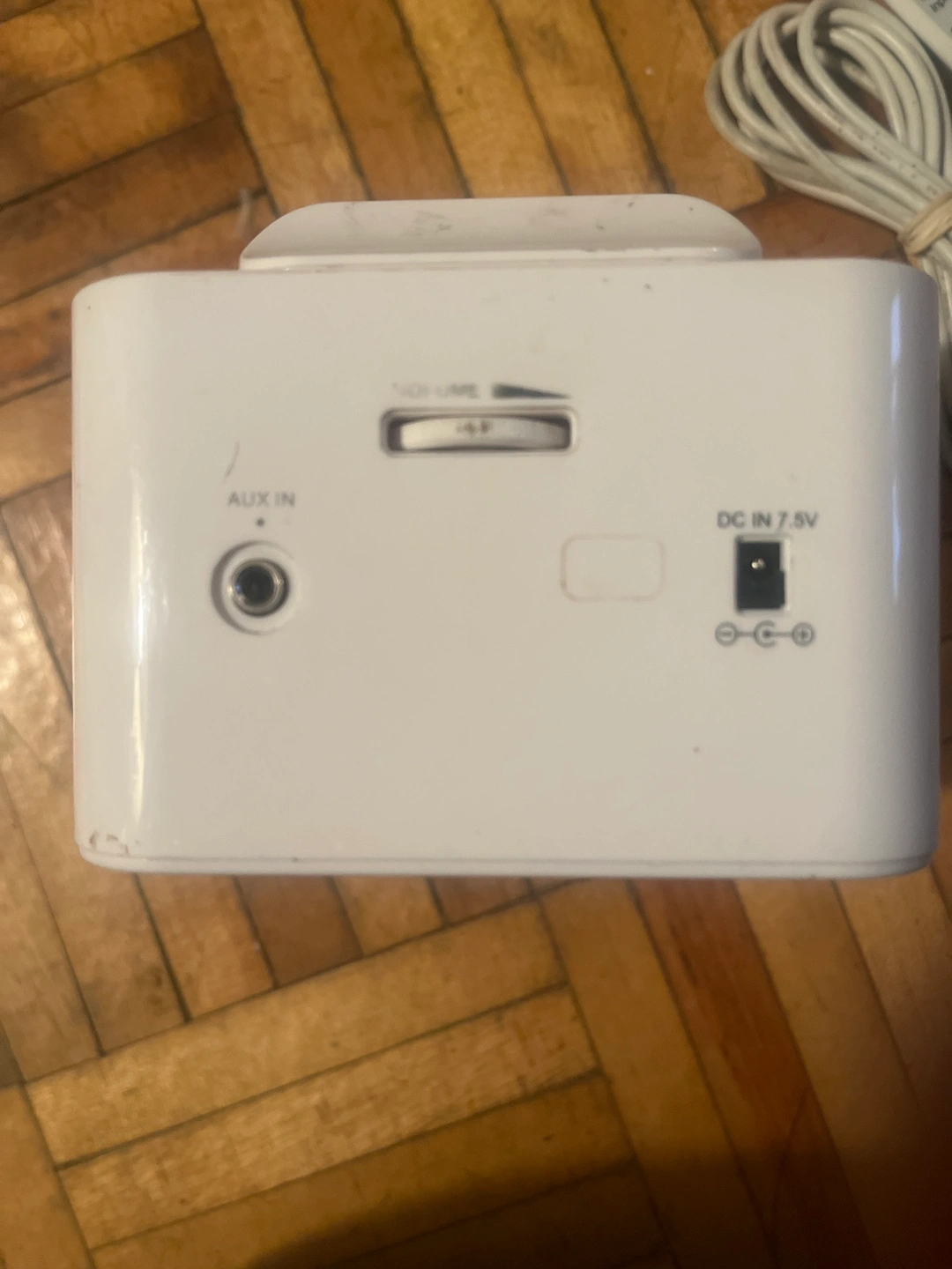 White clock radio with speaker, alarm, and docking station for an iPod or iPhone. Includes power adapter and power cable.