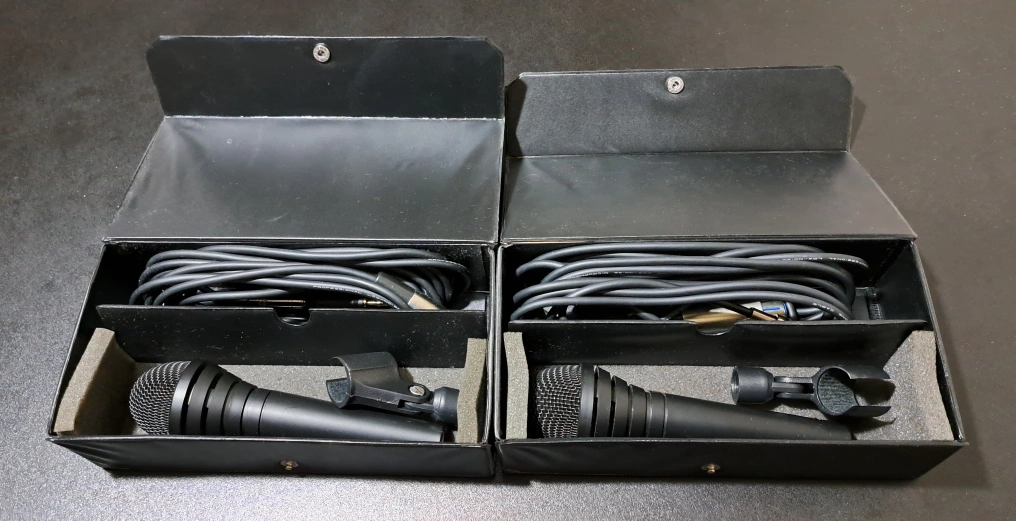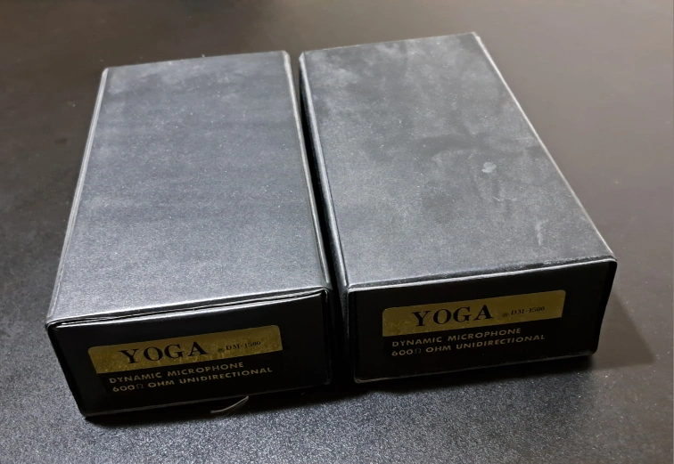 Two Yoga DM 1500 dynamic unidirectional microphones in their original boxes. Each microphone comes with a carrying case, a cable, and a mic clip. Have not been tested in a long time.
