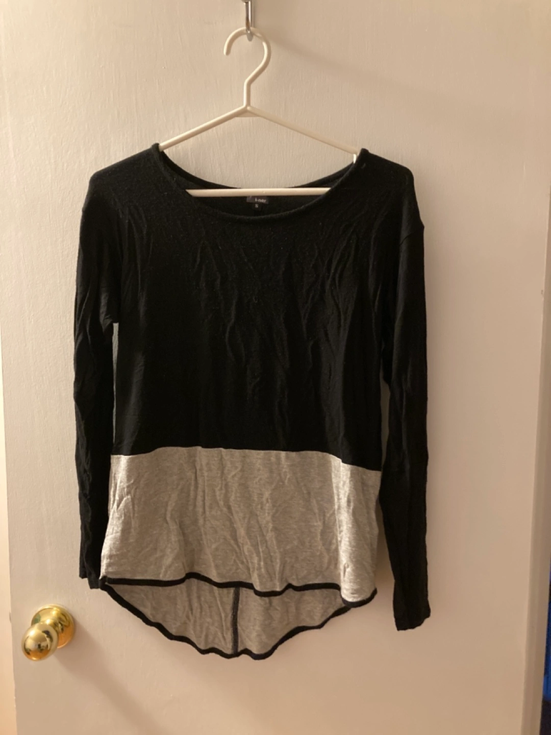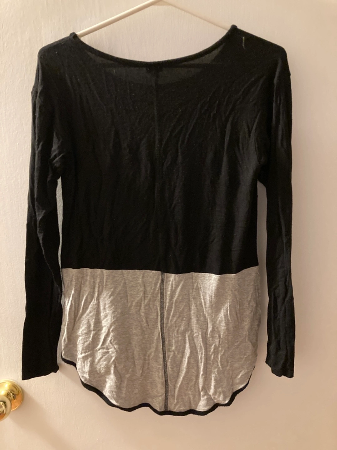 Colour block long sleeve shirt. Black and grey. Size small. Curved hemline. From smoke-free pet free home.