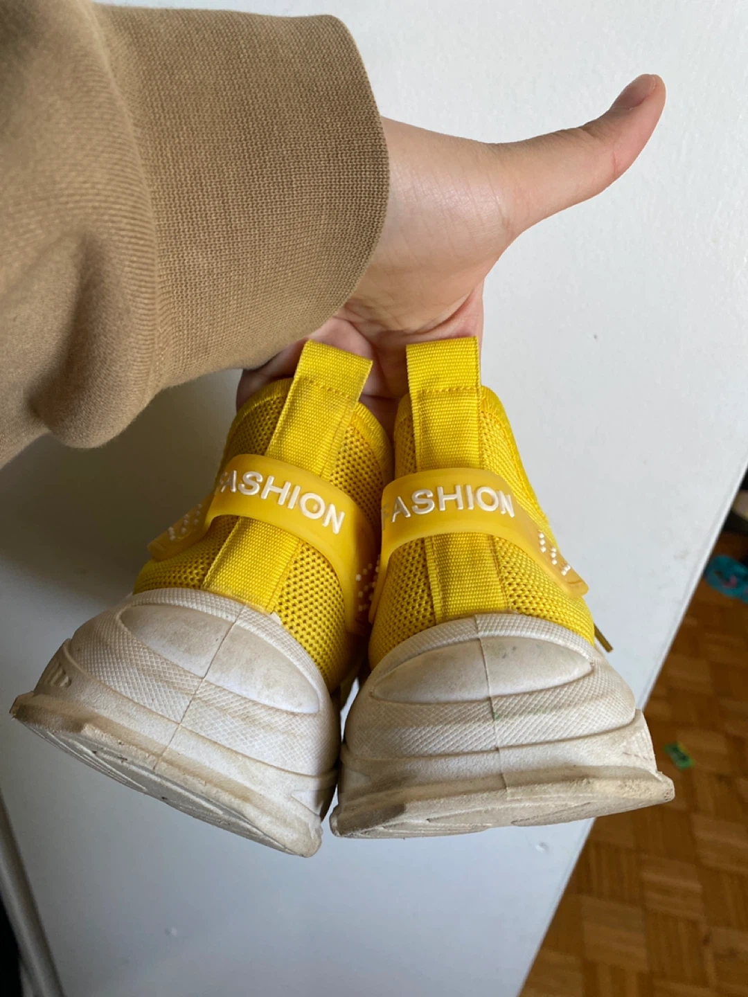 These yellow sneakers have a knitted upper and a chunky white sole. They're lightweight and comfortable for everyday wear. The "Fashion" detail is on the heel strap and tongue.