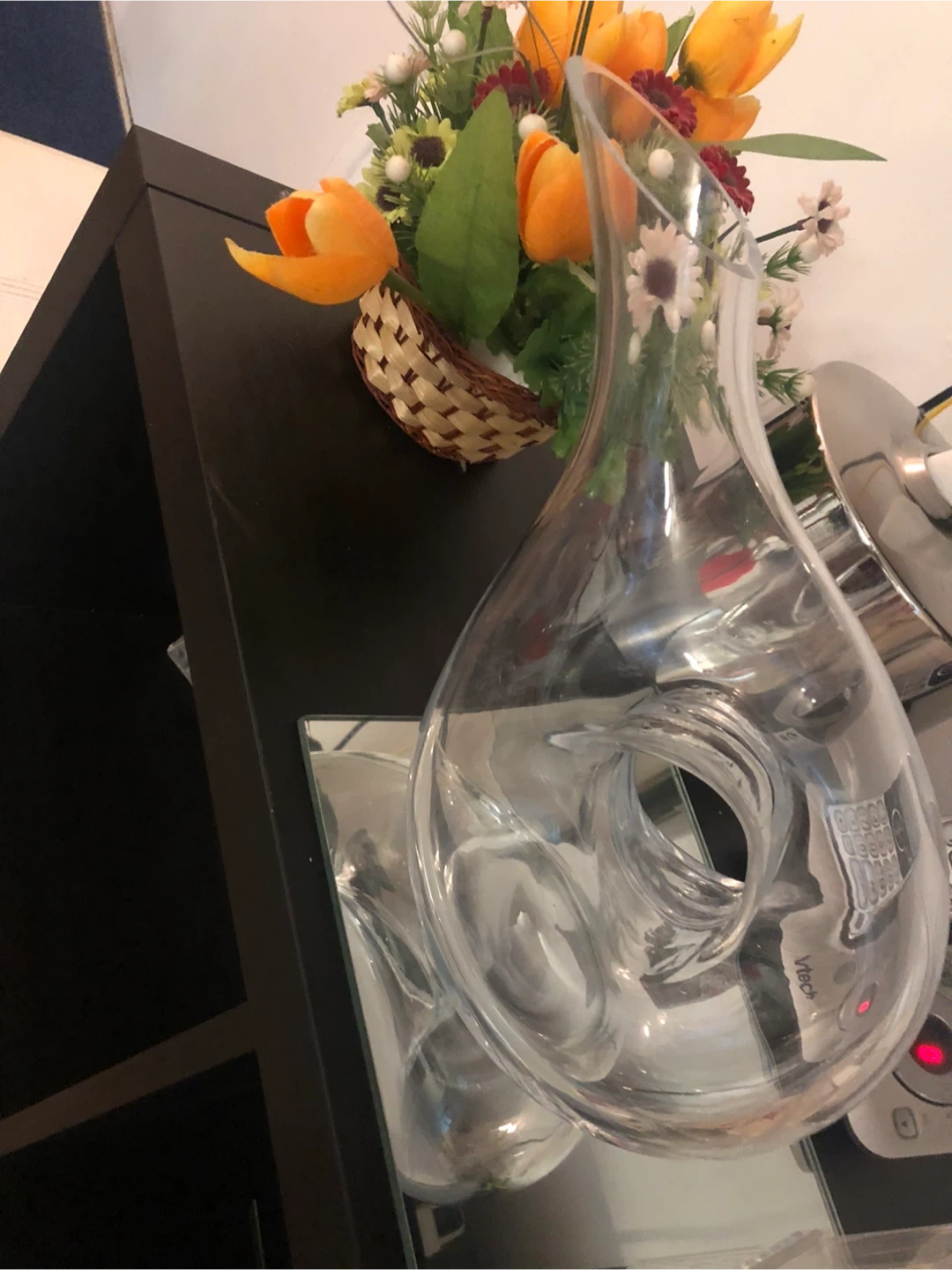 This is a clear glass wine decanter with a unique twisted interior. Its elegant design enhances wine aeration. Perfect for serving guests or enjoying a quiet evening. Made of clear glass.