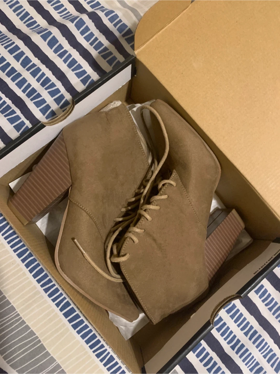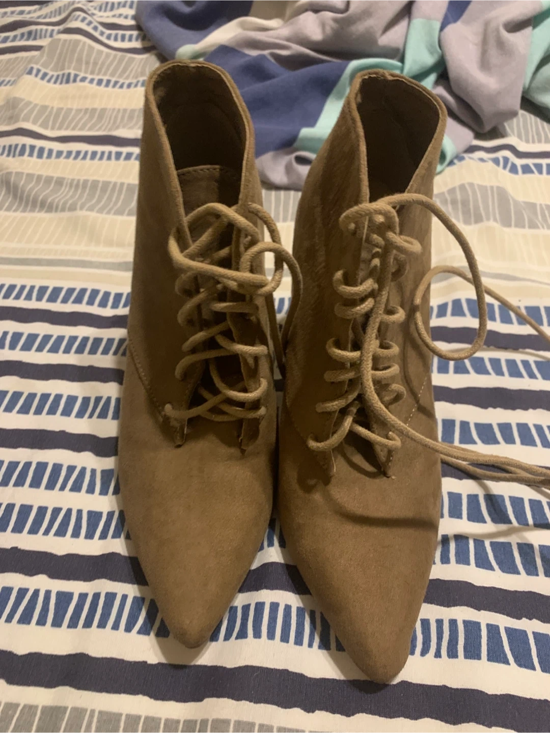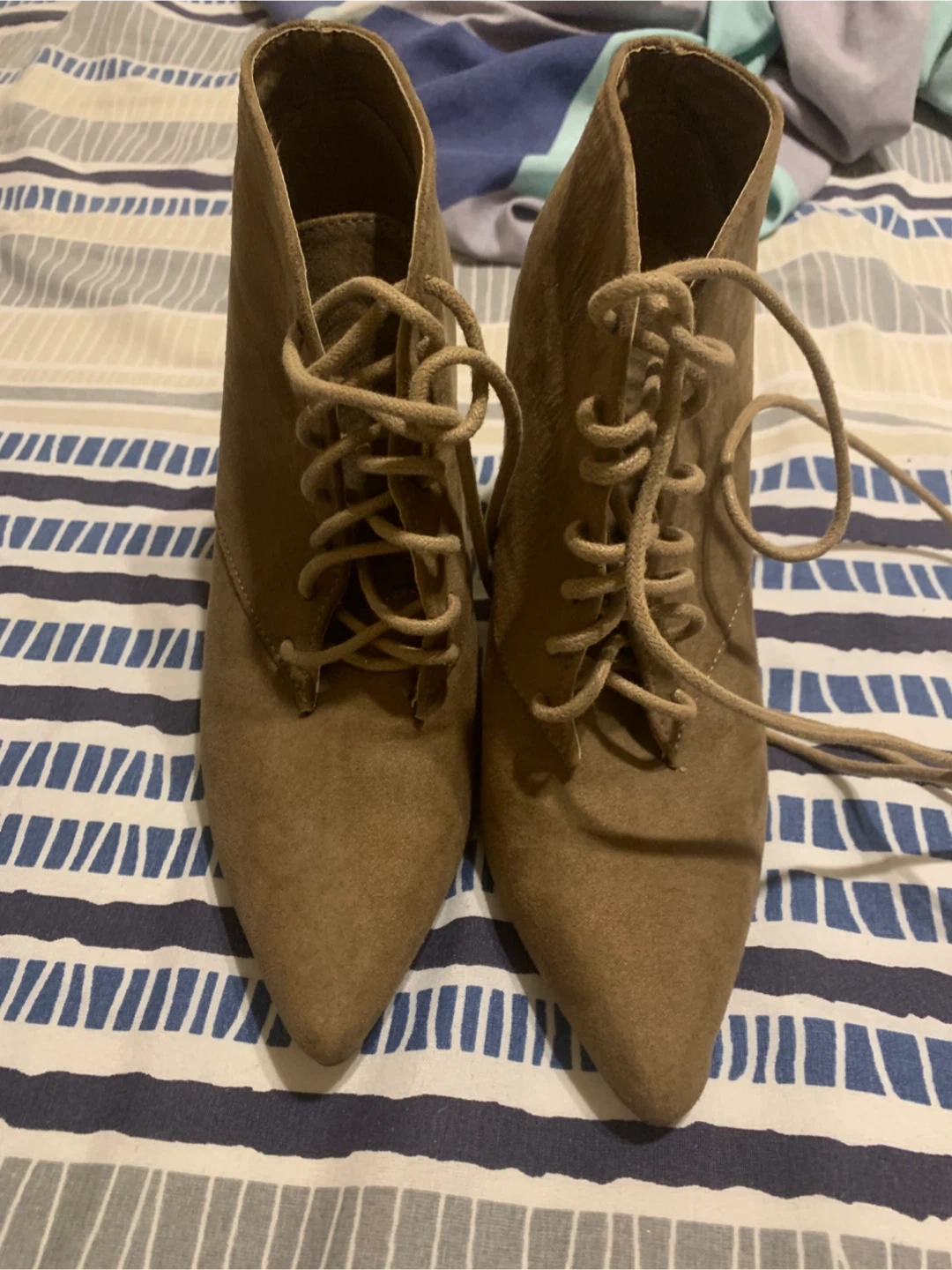 Selling a pair of brown lace-up heeled booties! They come in the original box. These are a stylish addition to any wardrobe