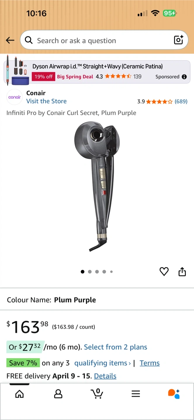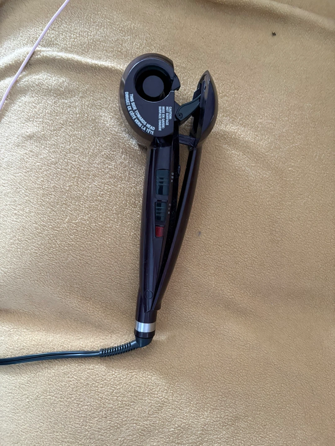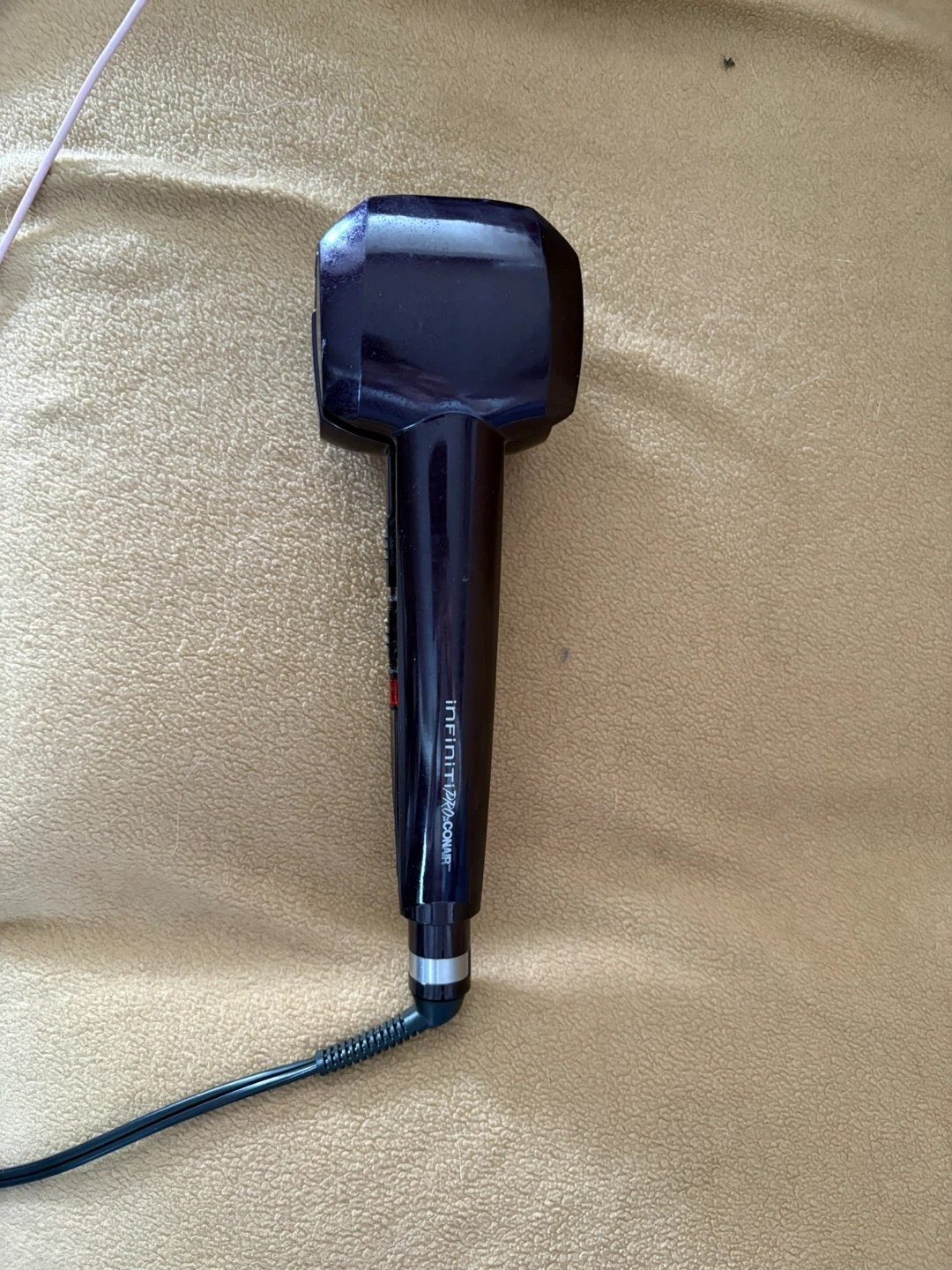 Infiniti Pro by Conair Curl Secret hair styler in plum purple. It's a device designed to automatically curl hair. This styler offers multiple heat settings for different hair types. Achieve salon-quality curls quickly and easily at home!