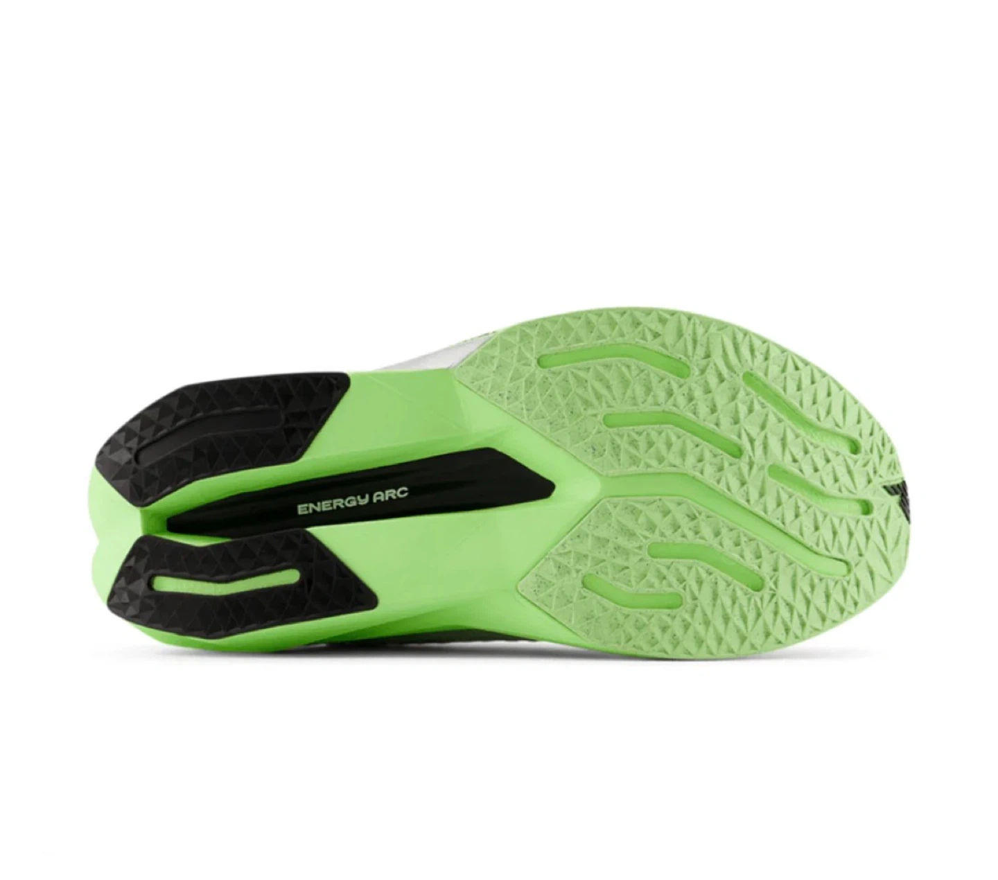 New Balance FuelCell Rebel v2 trainers in a light grey with neon green accents. Features include "Energy Arc" technology and "FuelCell" cushioning. Lace-up closure. Great for road running!