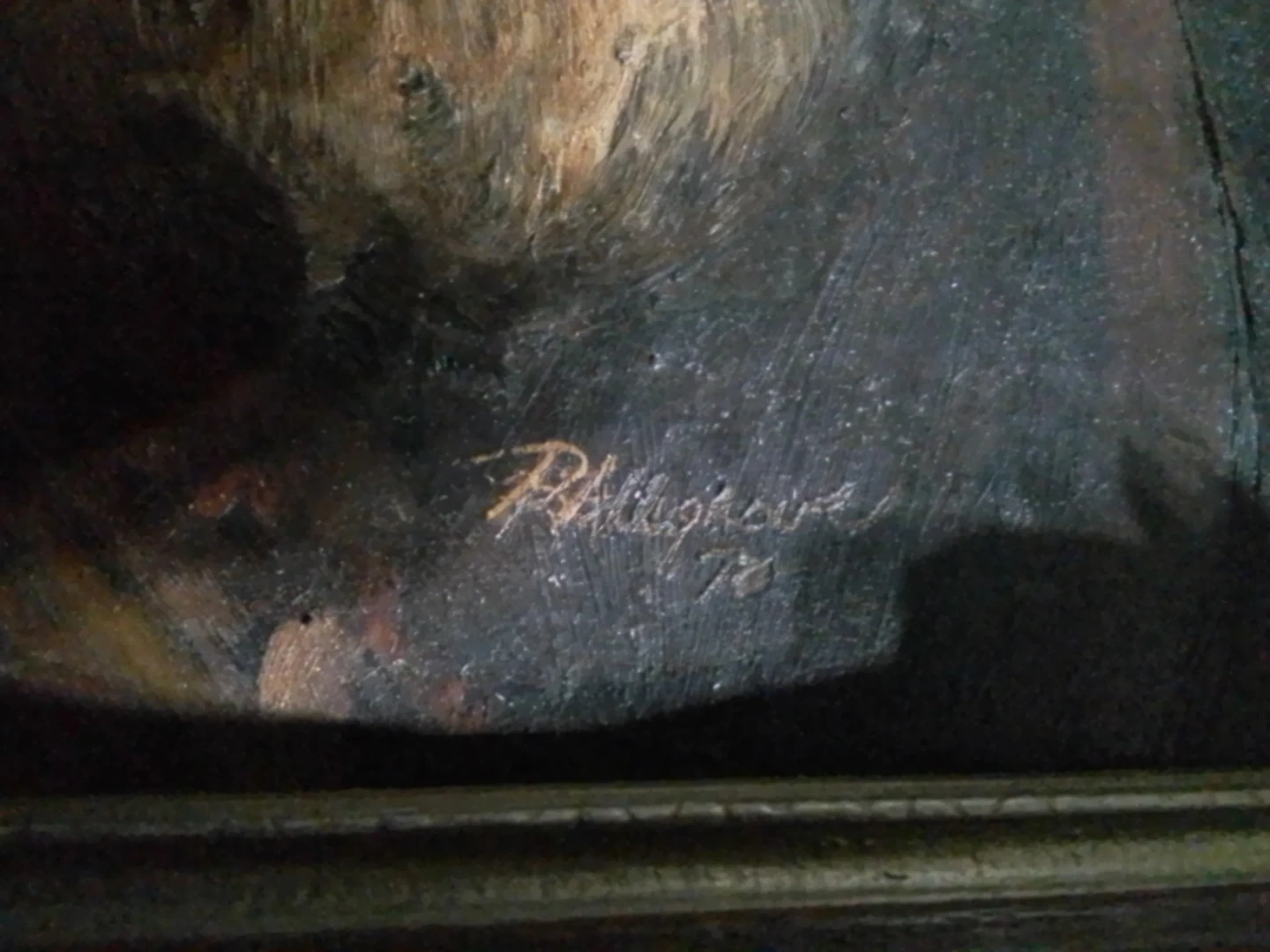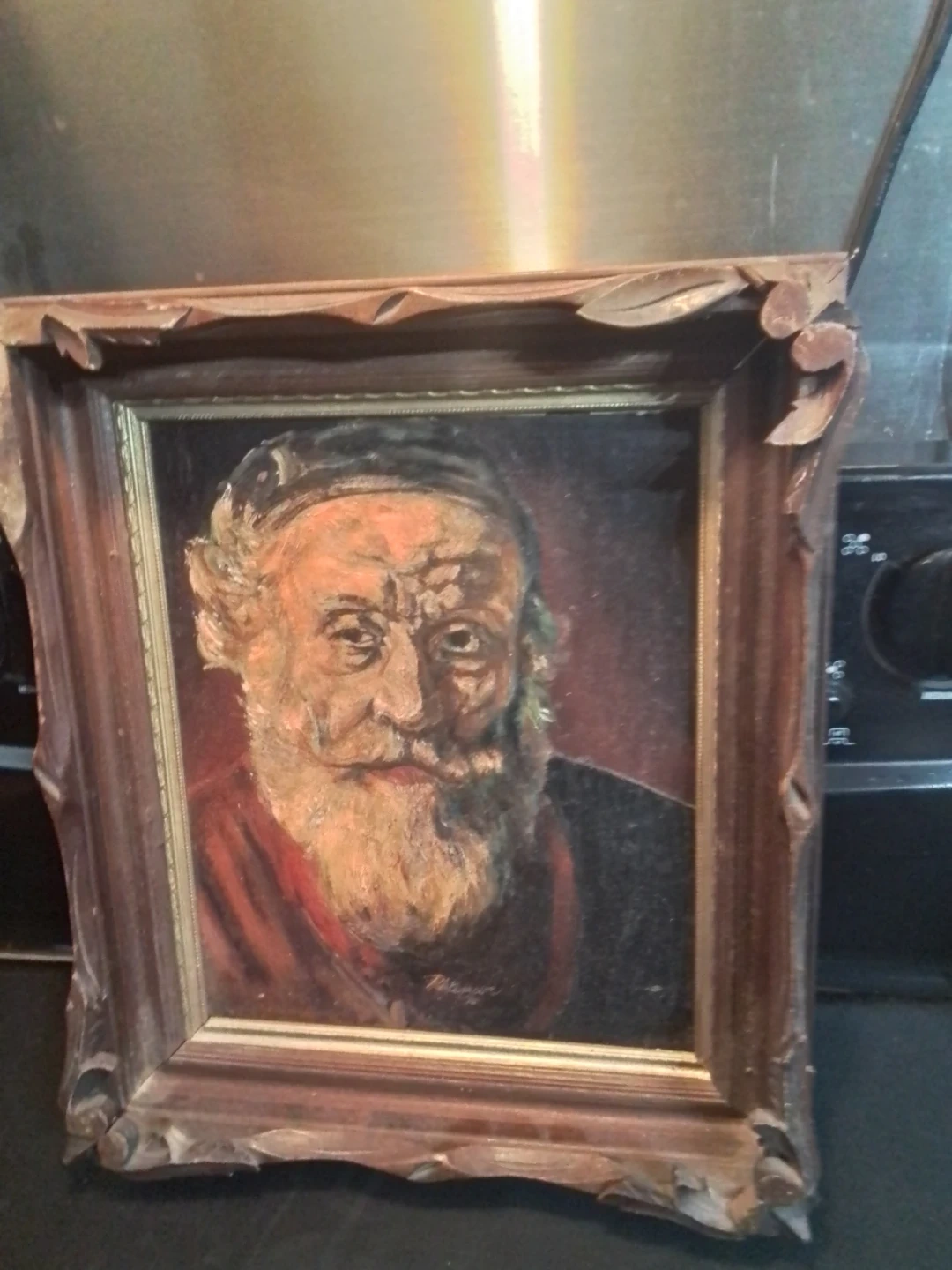 I'm offering a signed oil painting of a brilliant man, created in the '70s. The painting is in used condition and features a detailed portrait with a unique artistic style. The frame has some damage in the corners but does not detract from the overall viewing experience of this art piece. It measures 12.25 inches by 14.25 inches, making it a great addition to any art collection.