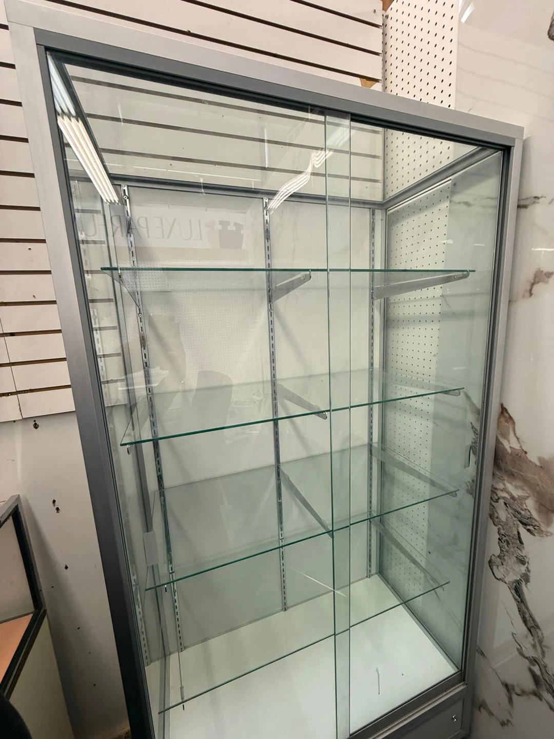 This glass display cabinet features multiple adjustable shelves and sliding glass doors. It's constructed with a durable aluminum frame. Perfect for showcasing retail items or collectibles!
