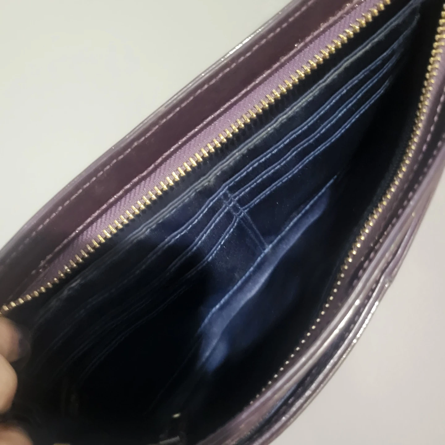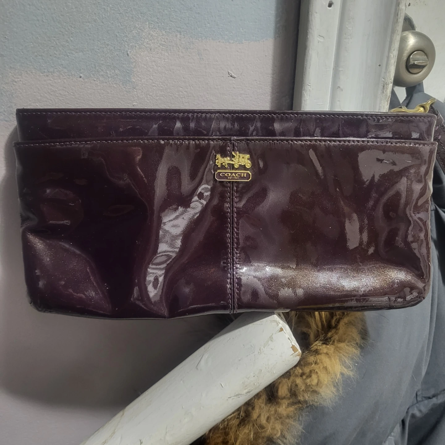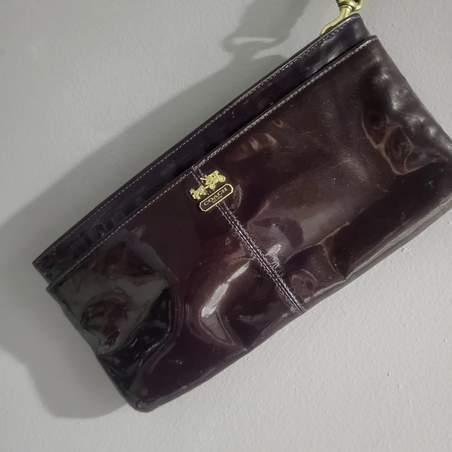 This is a Coach patent leather wristlet pouch. It's a dark plum colour and has a wrist strap. Multiple card slots are inside.