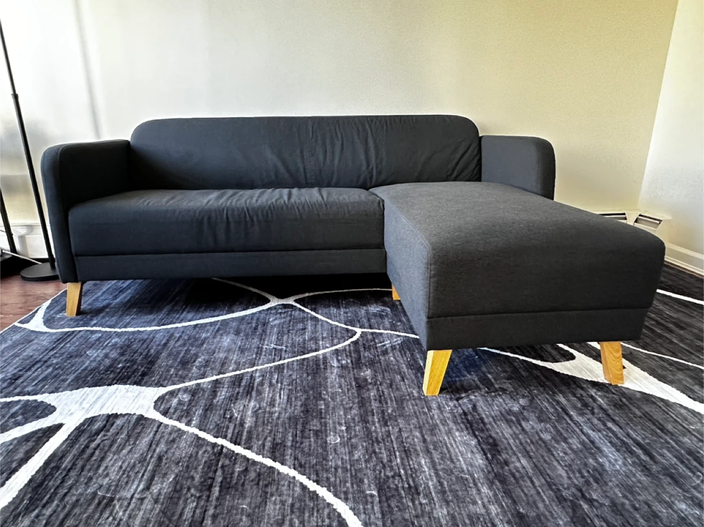 This dark grey sectional sofa features a chaise, perfect for stretching out. Its fabric upholstery and wooden legs offer a modern look. It's a great addition to a living room or apartment space!