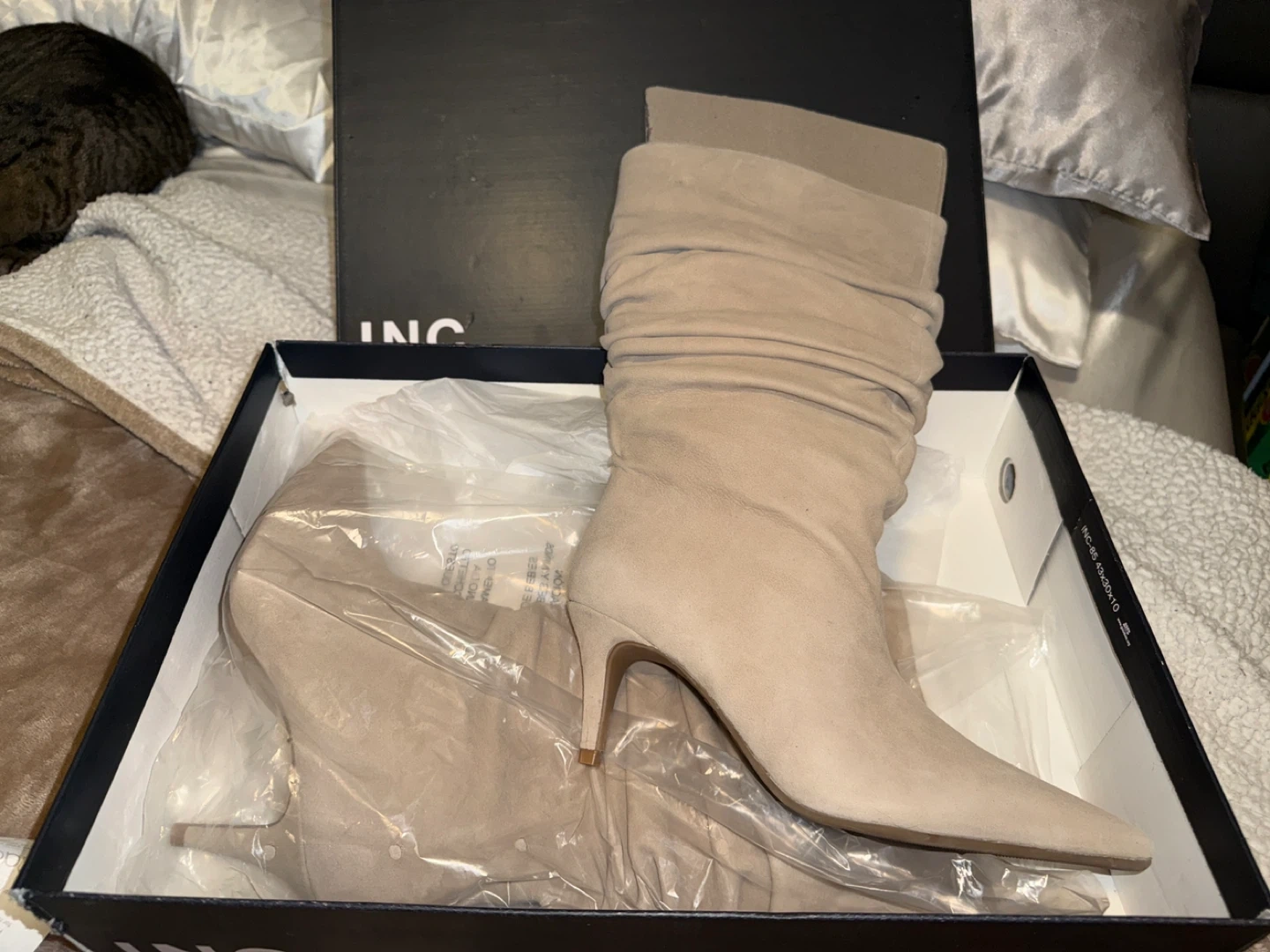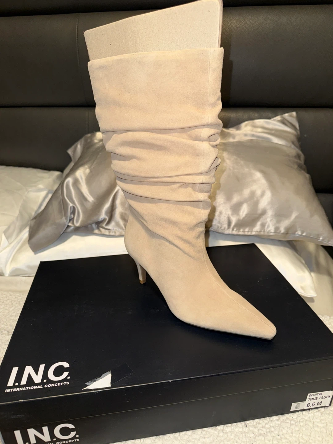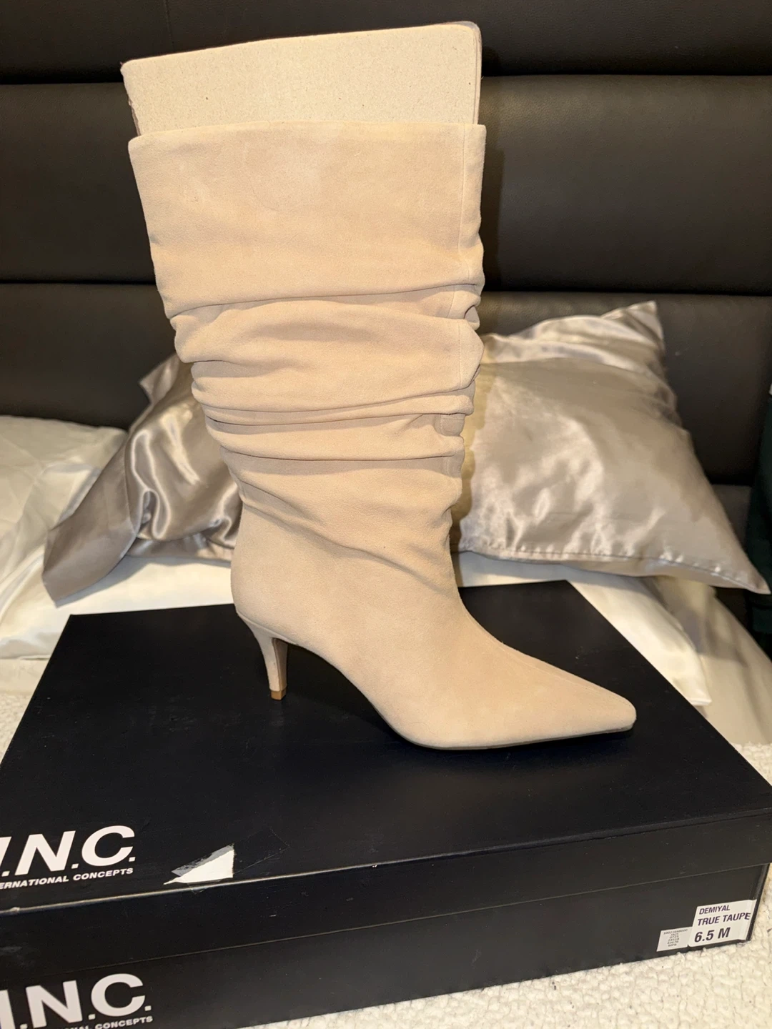 Brand new INC International Concepts "DEMYTA" slouch boots. Comes in a beautiful True Taupe color. Size 6.5 M. Boots are in their original box and packaging.