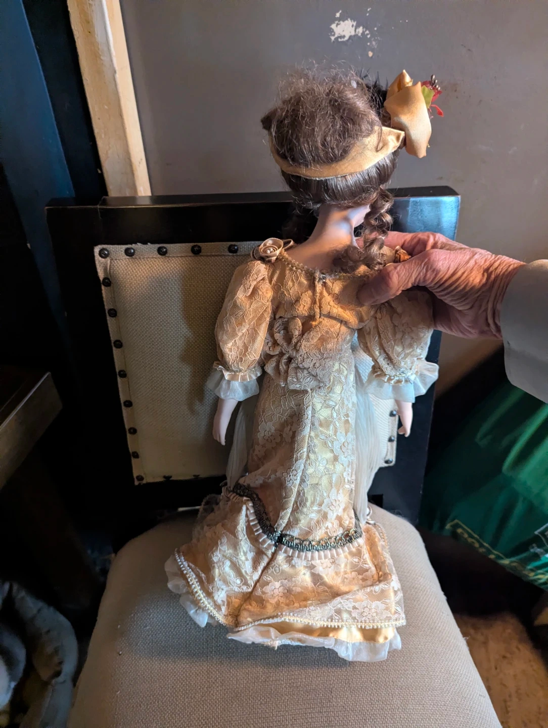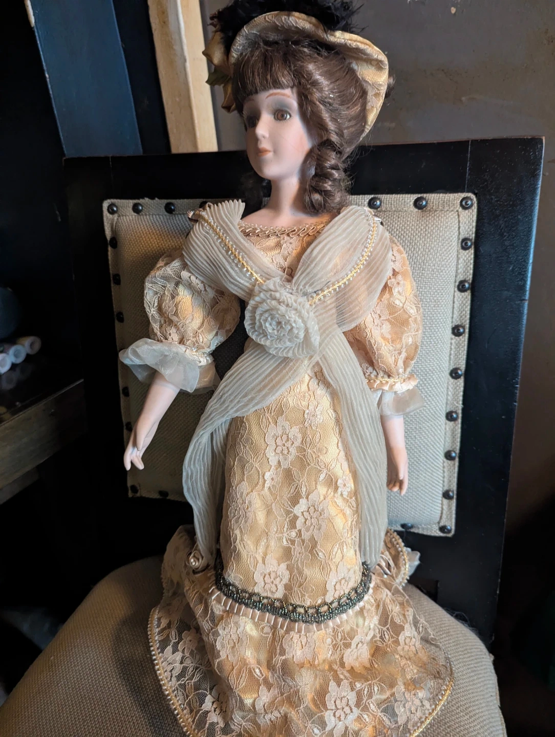 This is a beautiful porcelain collectible doll. She's wearing an intricate lace and satin gown. This doll would make a lovely addition to any collection. Complete with stand. Turn of the century Franklin Mint heirloom collection. Firm price