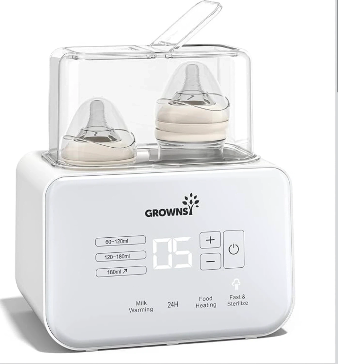 Grownsy bottle warmer with 24H constant temperature. Features milk warming, food heating, and fast sterilize functions. It's handy for keeping milk warm or sterilizing baby bottles.
