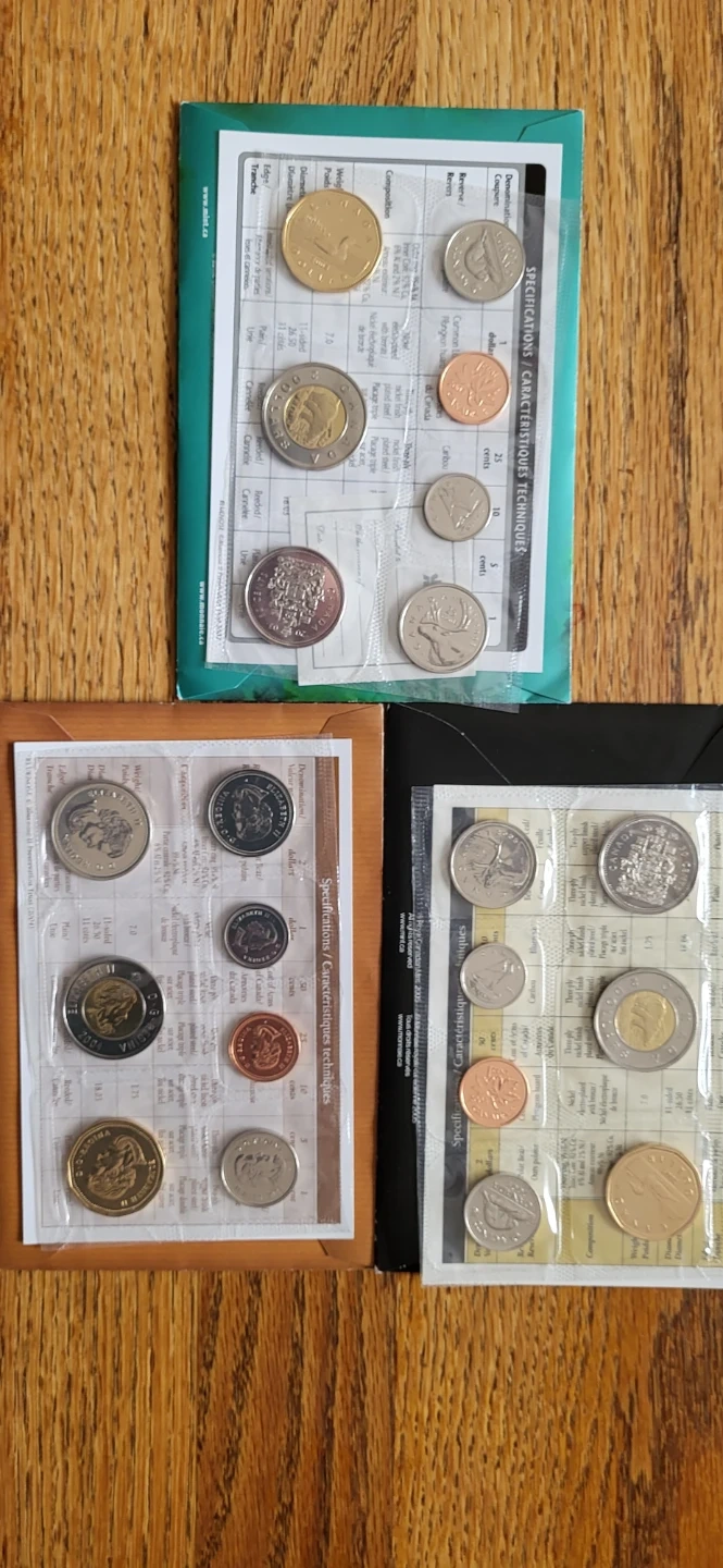 Collection of Canadian coins in protective packaging. Includes various denominations from different years. Mint condition coins.