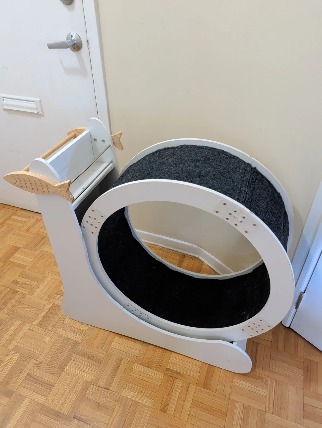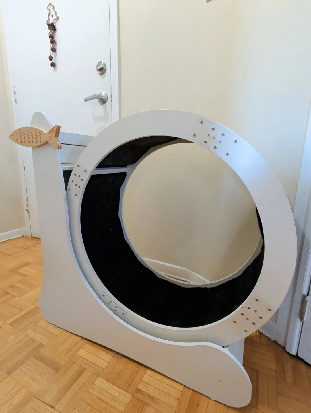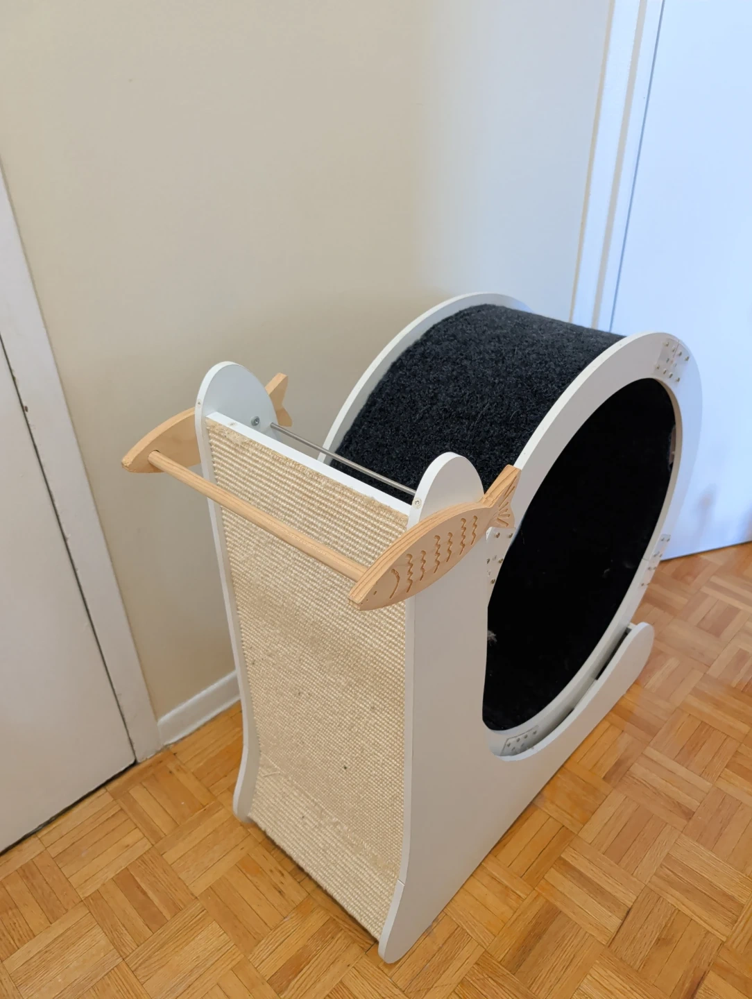 This unique cat scratcher features a rotating wheel covered in carpet and a sisal rope scratching post. It's designed to entertain and satisfy your cat's natural scratching instincts. The wooden accents with fish designs add a cute touch to its appearance.
