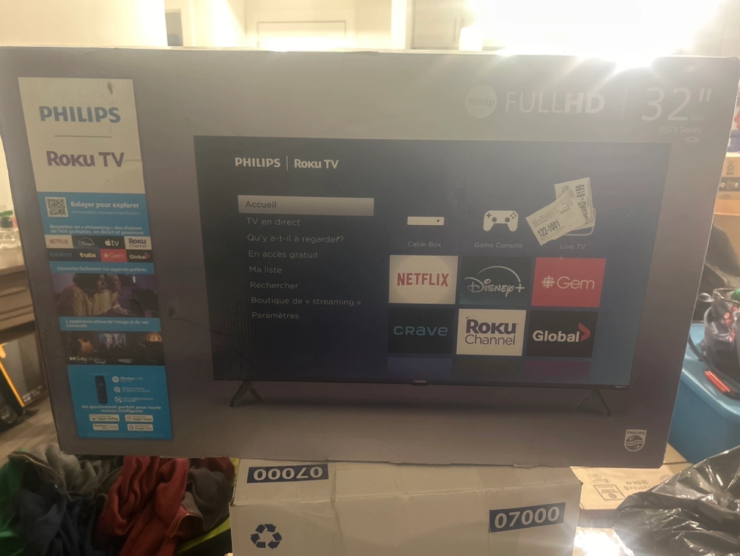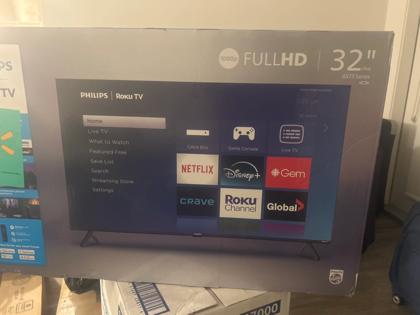 1832-inch Philips Roku TV. Full HD 1080p. New in box. 6573 series. Features Netflix, Disney+, Crave, Roku Channel, and more.