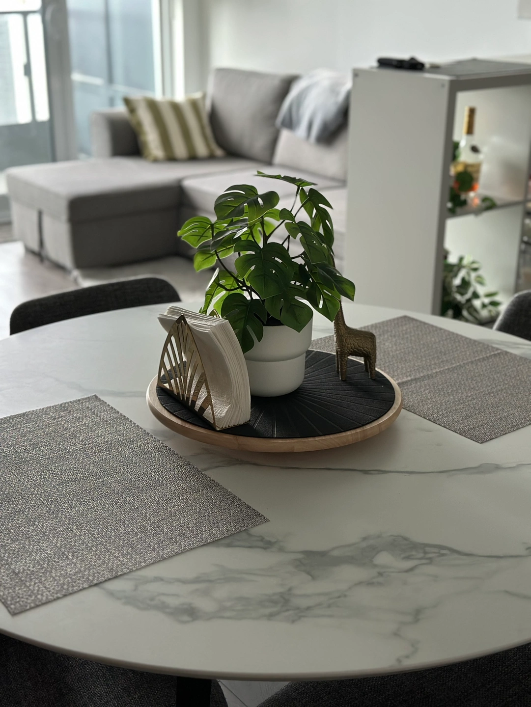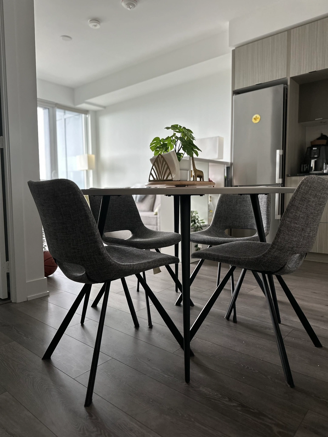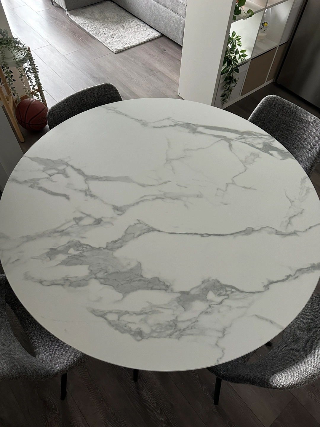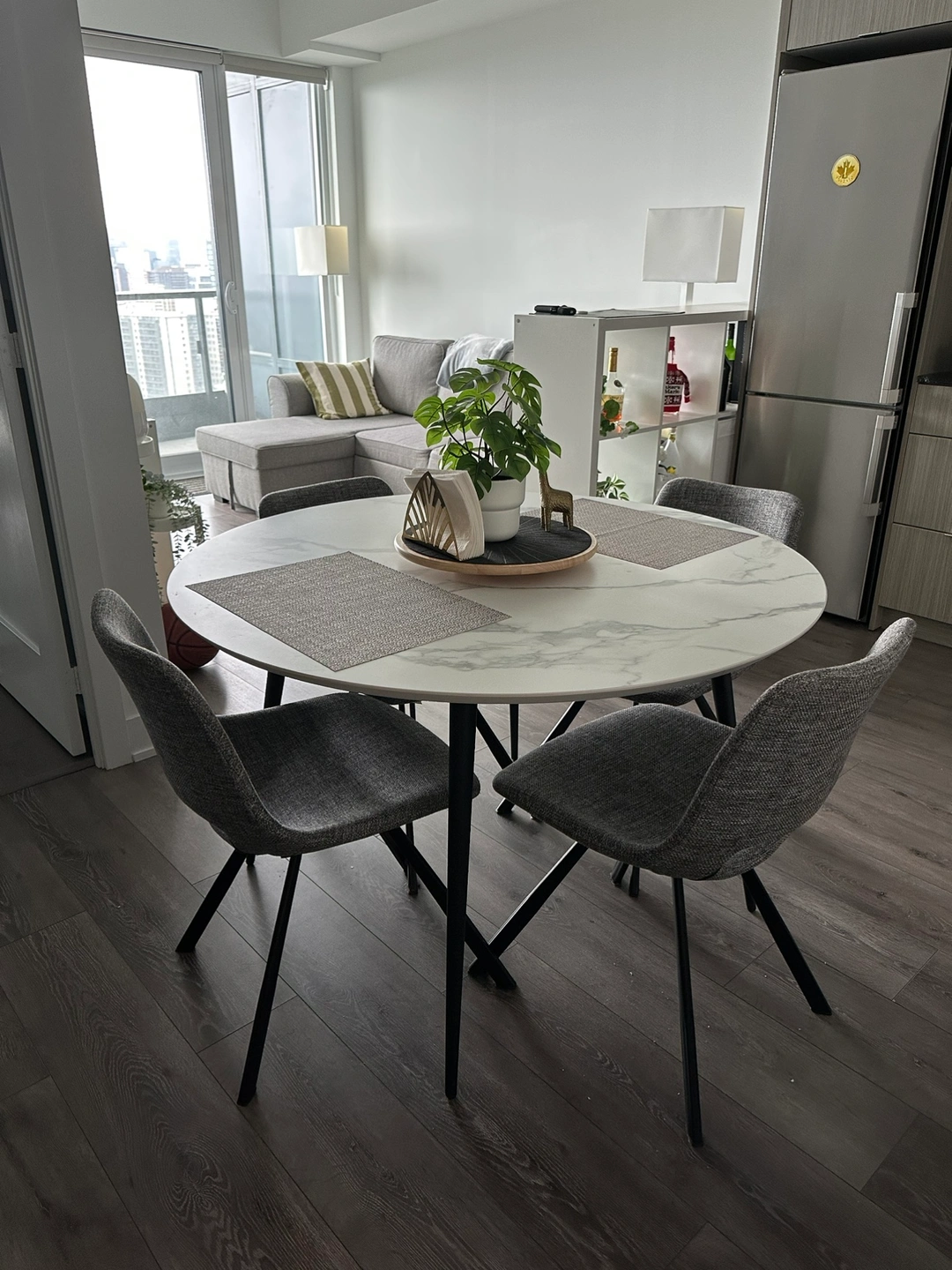 Dinning set from Structube: This set includes a round, white marble-look dining table with black metal legs and four grey fabric chairs with black metal legs.