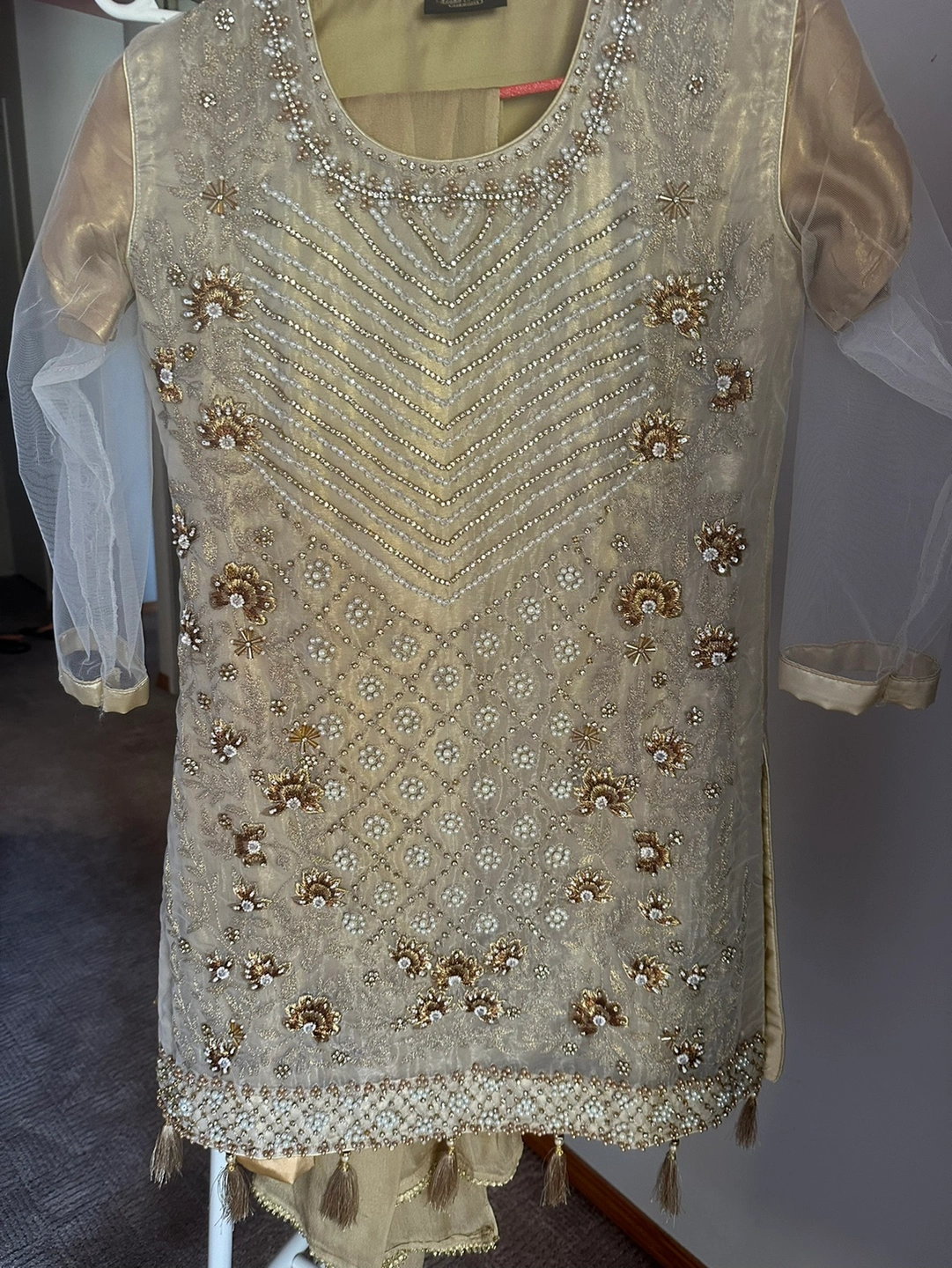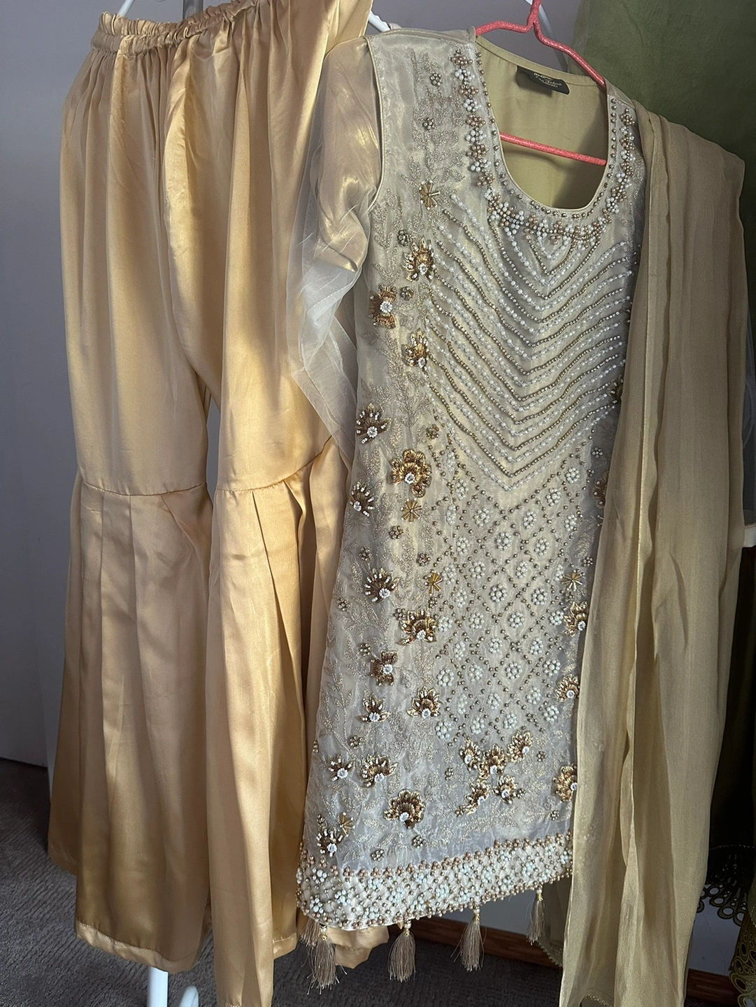 This is a beautiful 3-piece suit with an embroidered shirt& plain matching garara and a dupatta.The shirt has intricate golden embroidery with zarri,pearls, stones and sequins. The suit is perfect for a special event Price $80.
