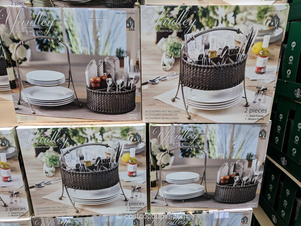 This is a two piece Yardley Woven Picnic Caddy. The set includes a woven basket with a metal stand. The basket has a handle and is divided into 6 compartments.