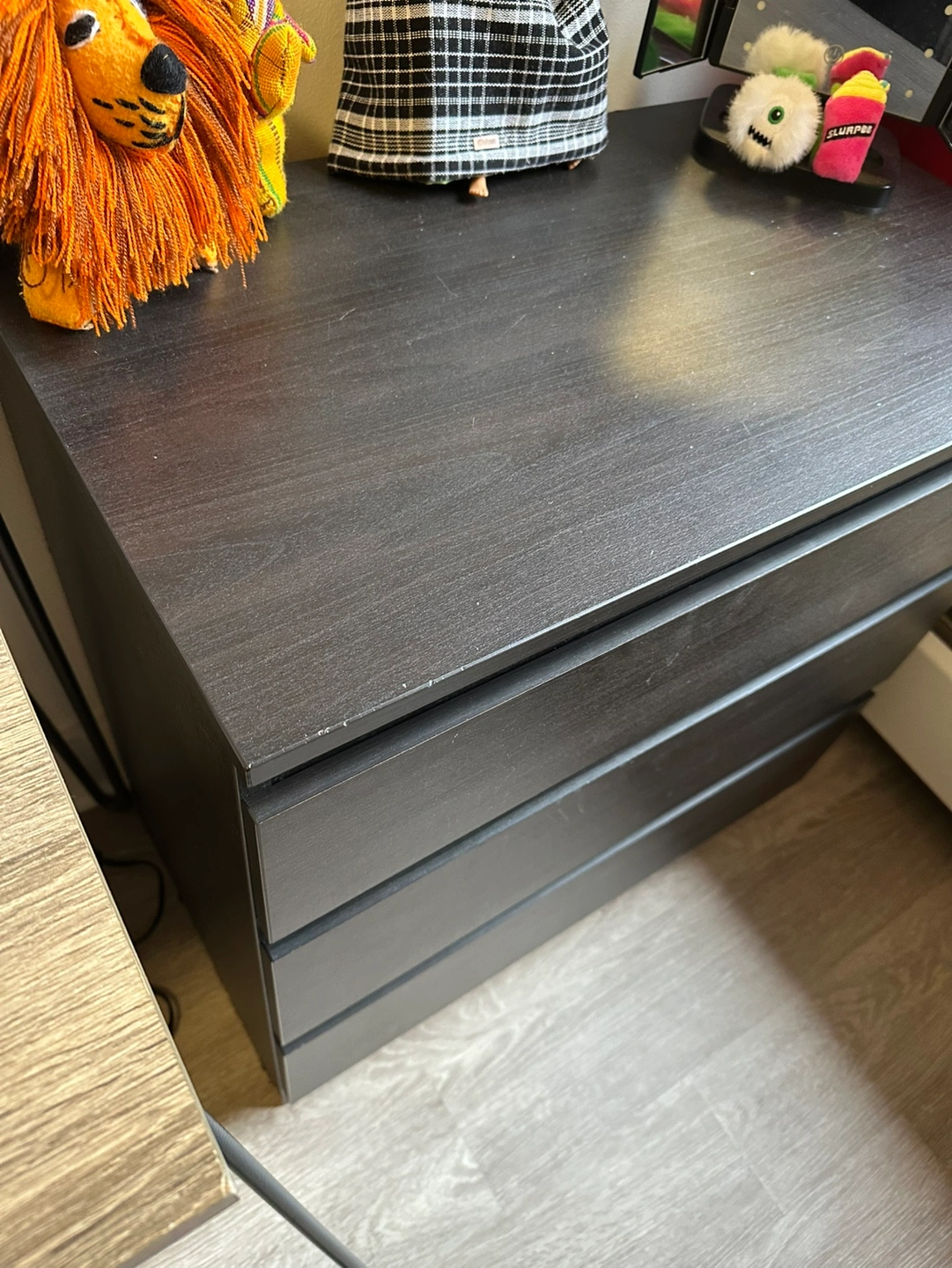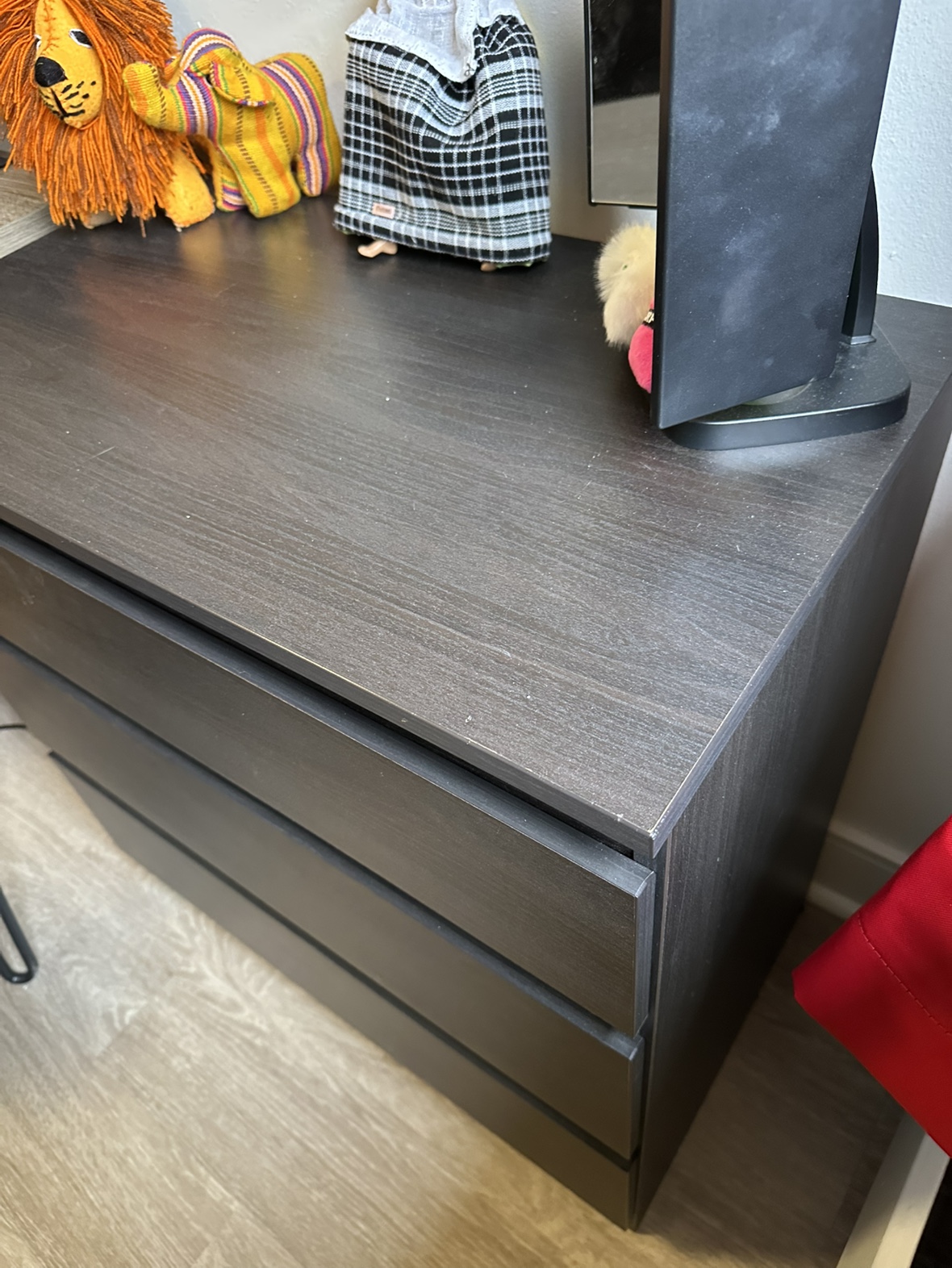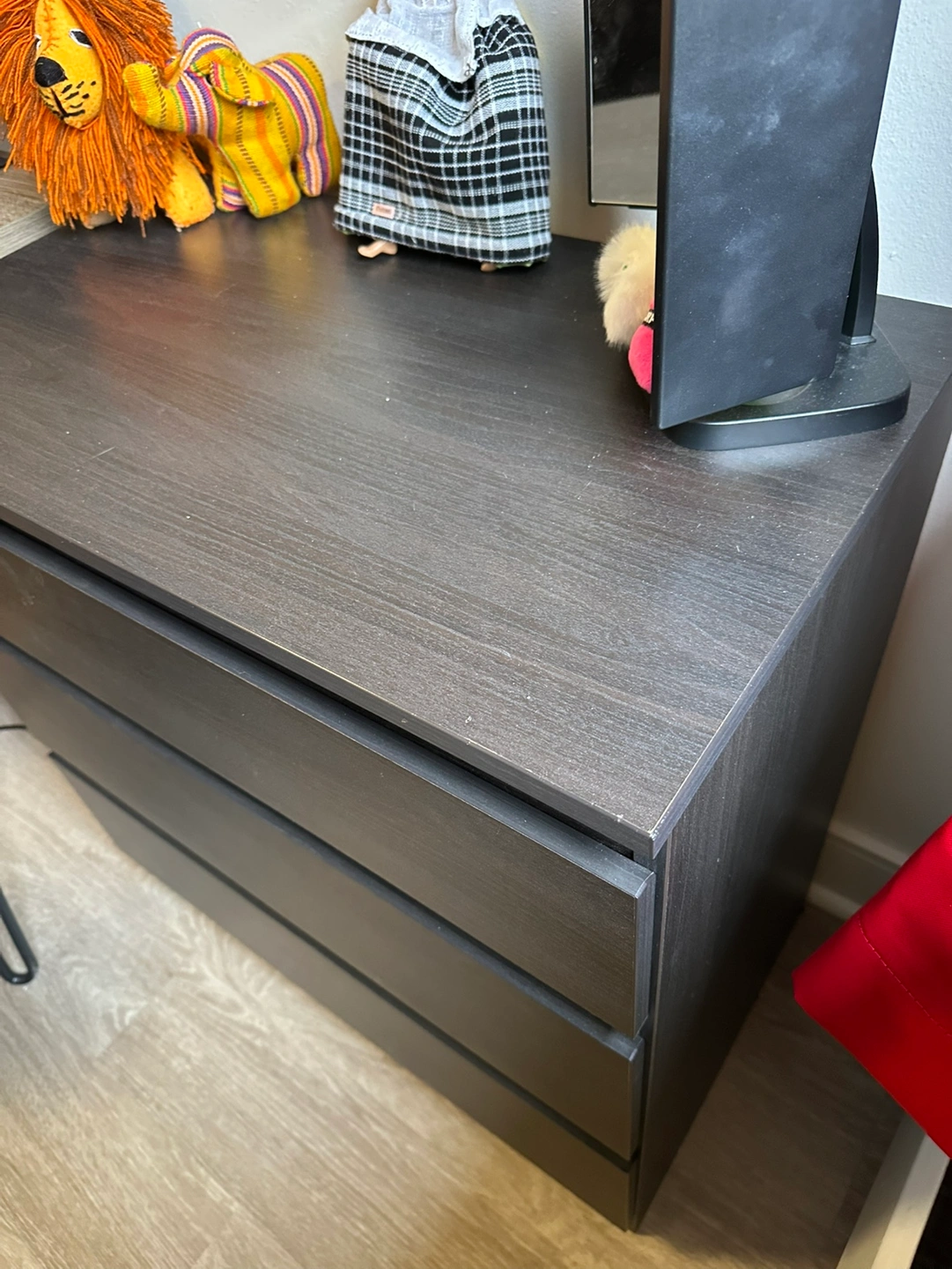 A dark grey wooden nightstand with three drawers. The nightstand is approximately 24" wide and 27" tall. It is in good condition, but there is a small scuff mark on the top.
