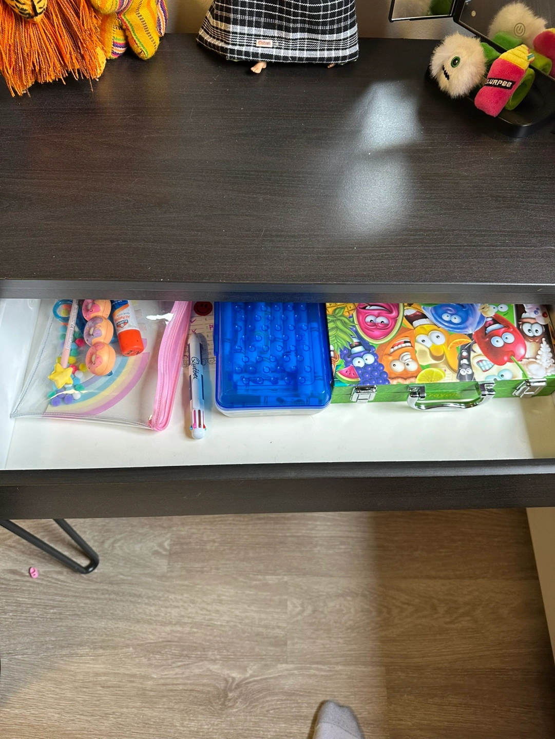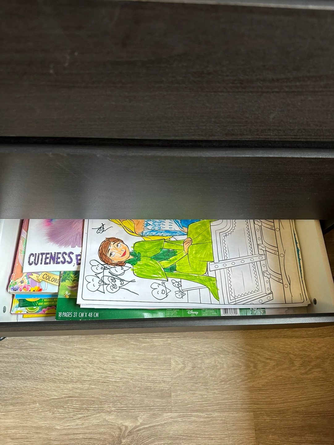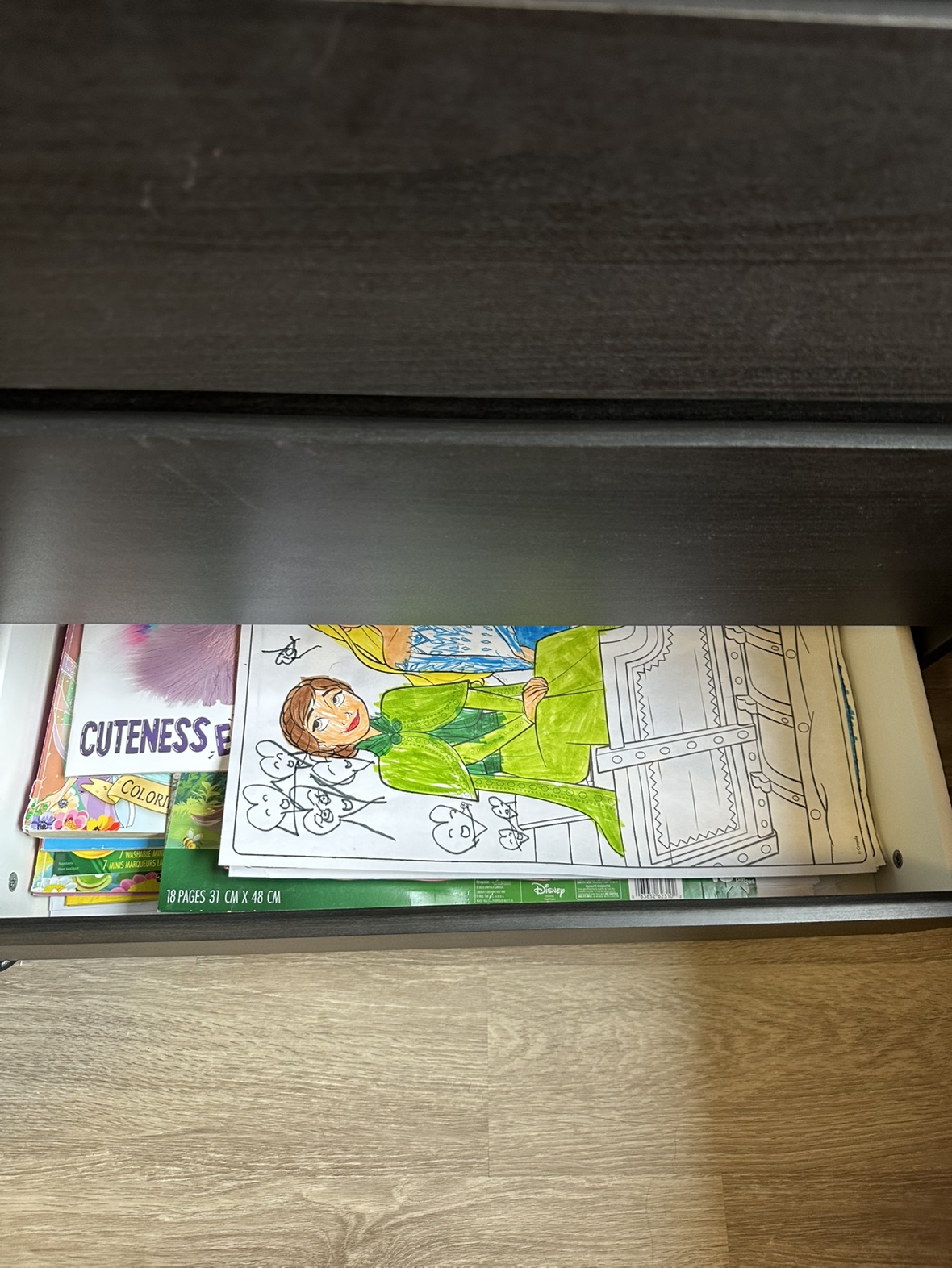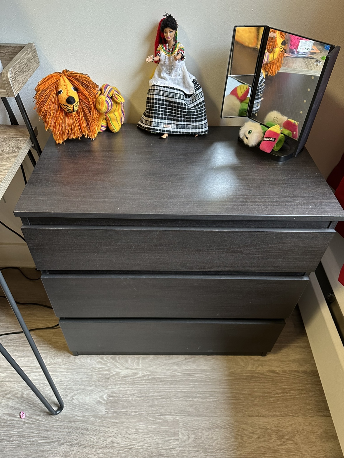 A dark grey wooden nightstand with three drawers. The nightstand is approximately 24" wide and 27" tall. It is in good condition, but there is a small scuff mark on the top.