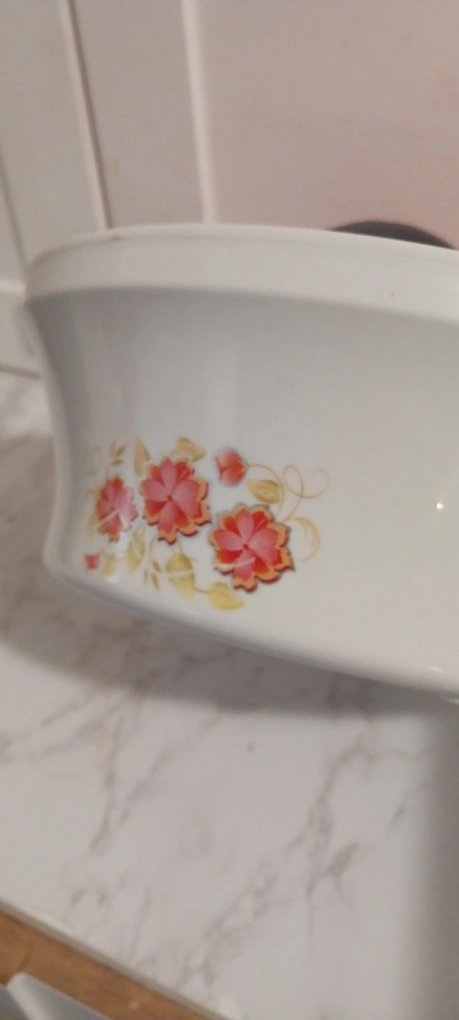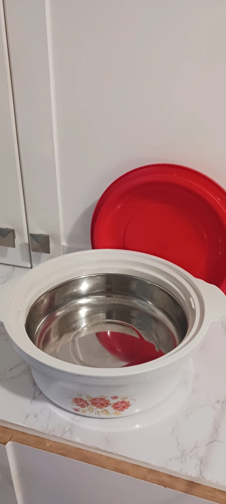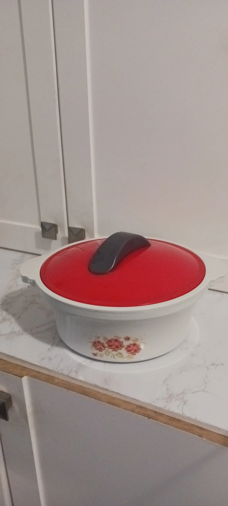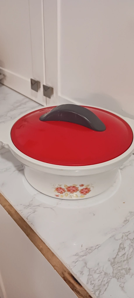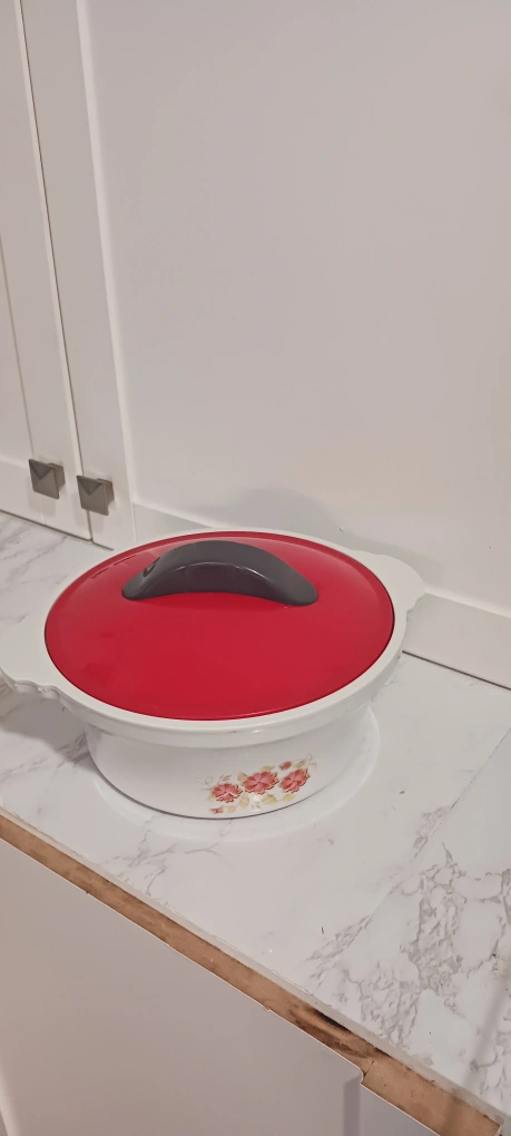 elegant thermal food storage container with a red lid and white base with floral design. It has a stainless steel inner. It has two carrying handles on either sides. its a movibg sale.