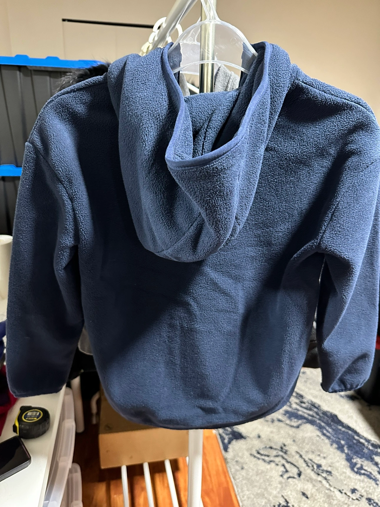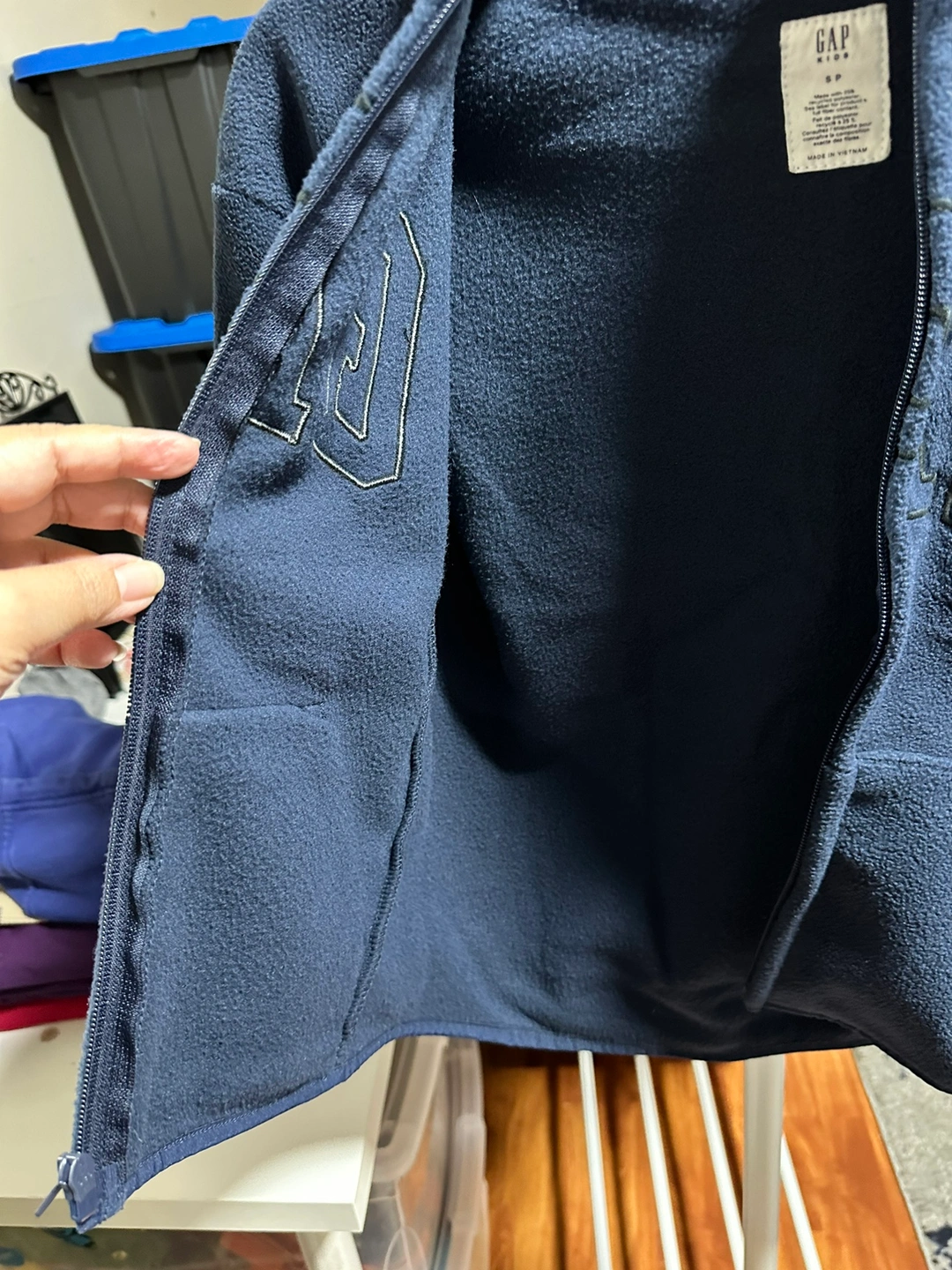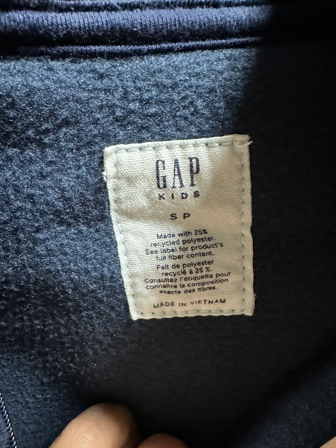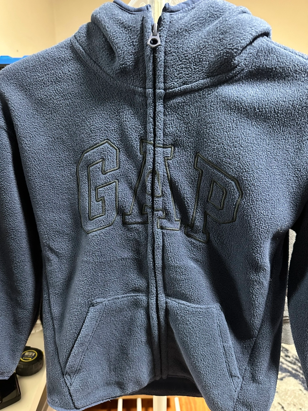 New Never Used. Blue fleece hoodie with zip up front and a hood. Has front pockets and the Gap Kids logo on the front. Made of 25% recycled polyester. Size SP. Made in Vietnam.