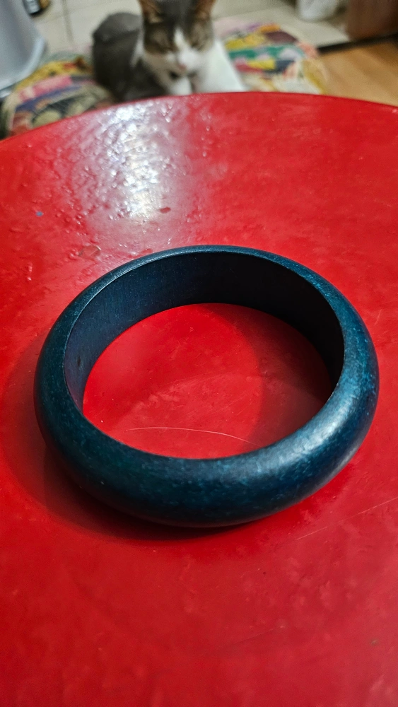 This is a dark green, wooden bangle with a smooth finish. It is 7cm in diameter. Available for pick-up near Oakwood Village.