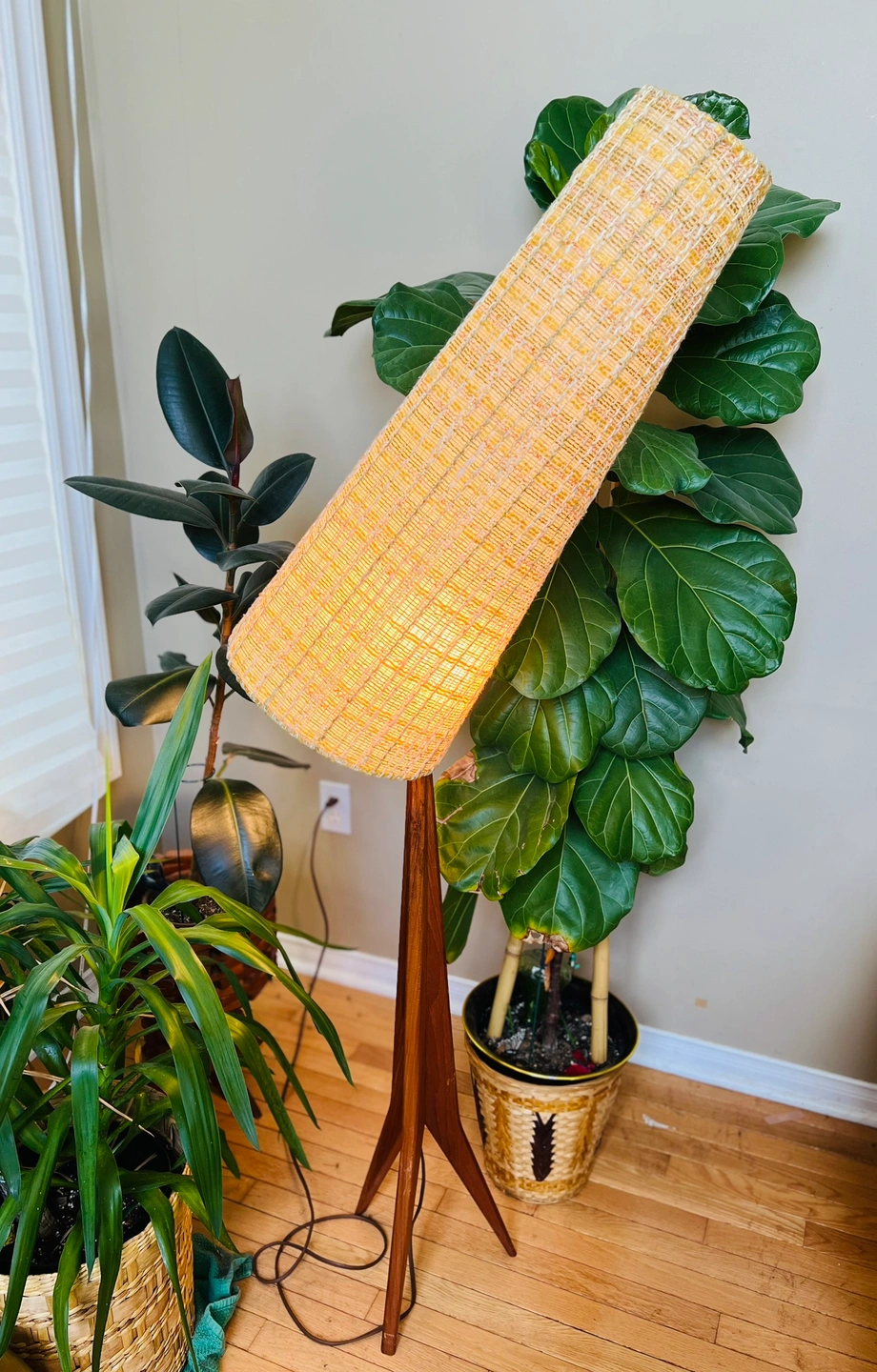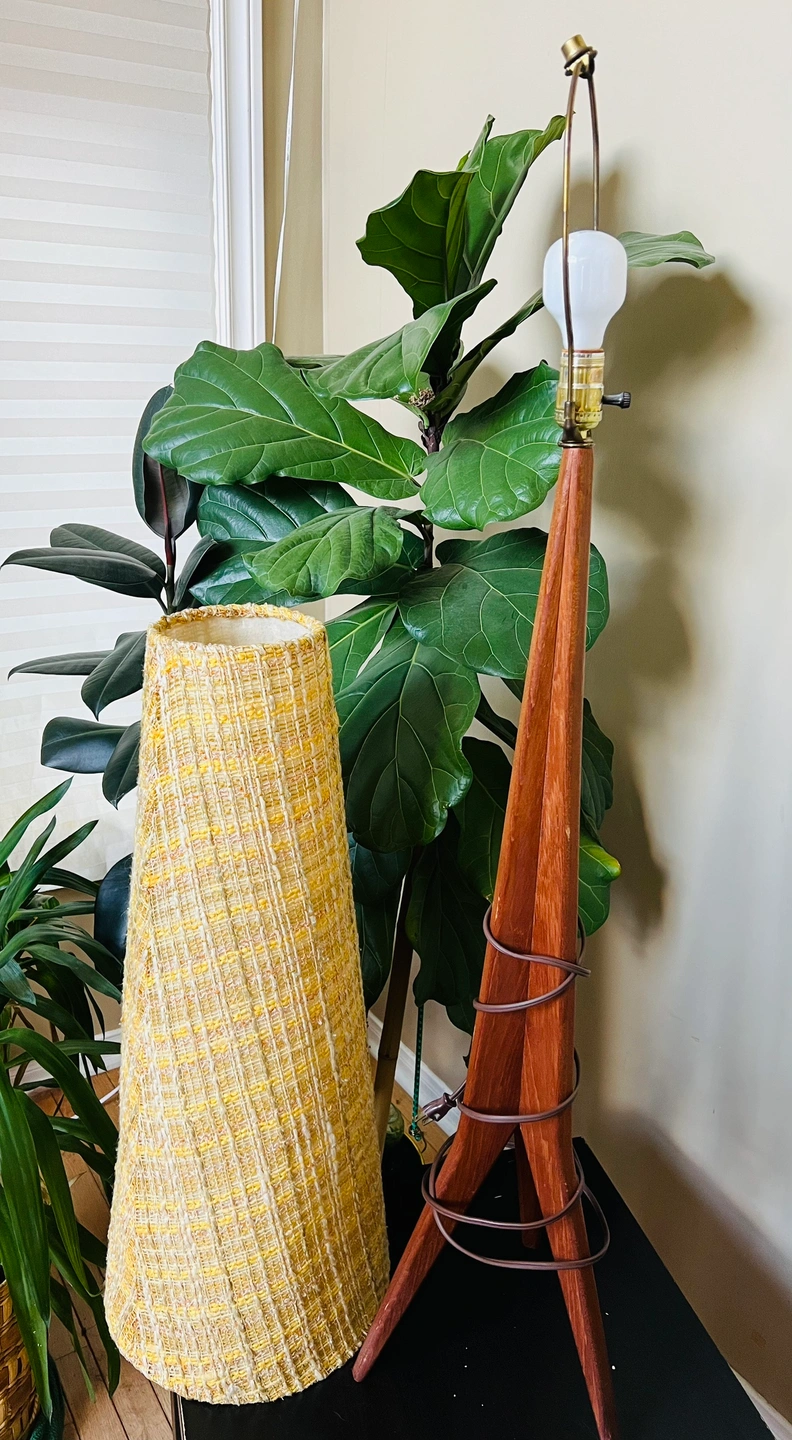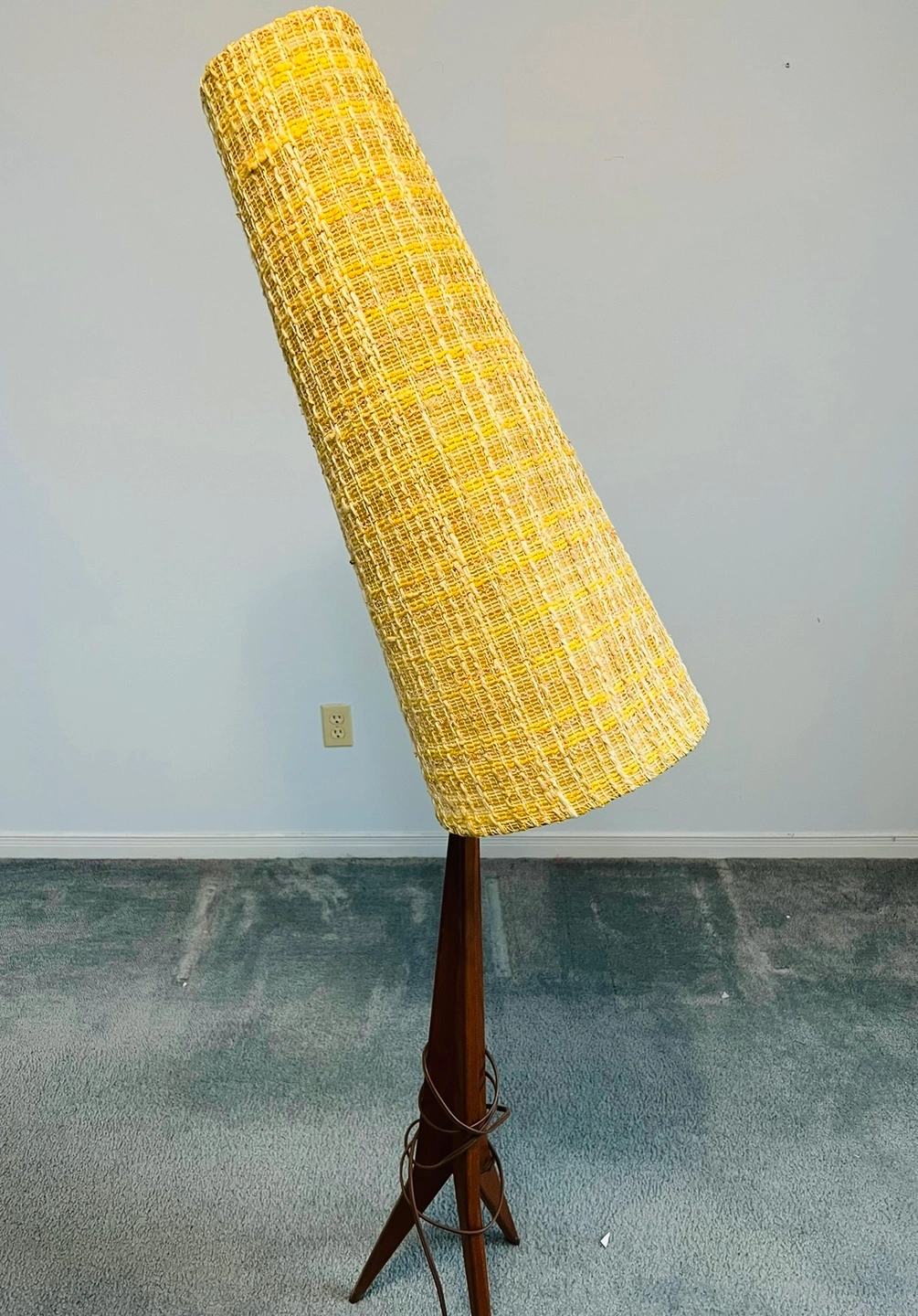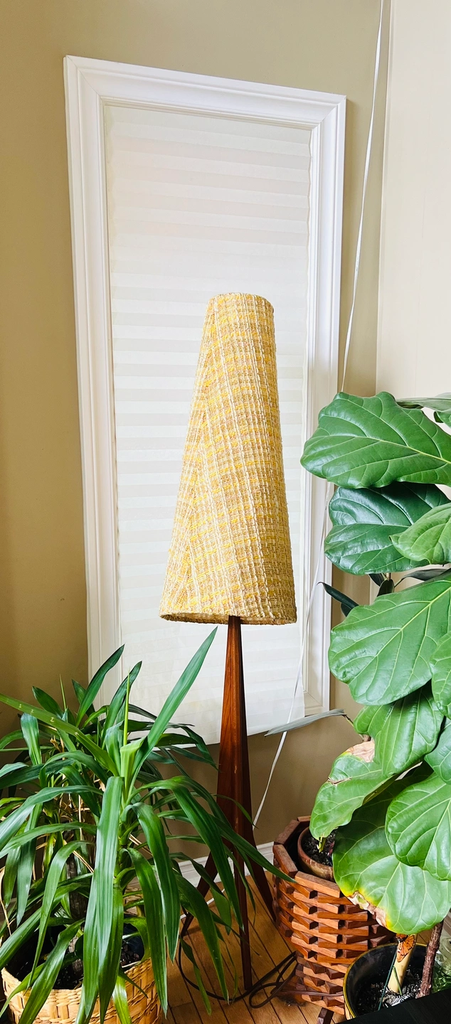 This is a vintage floor lamp with a wooden tripod base and a yellow fabric lampshade. The lamp has a brass socket and a black rotary switch. The lamp is in good condition with minimal signs of wear.