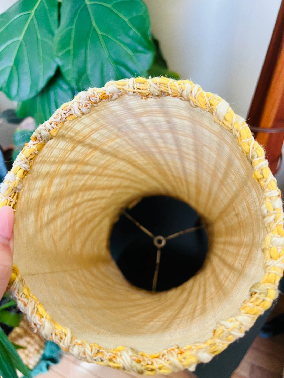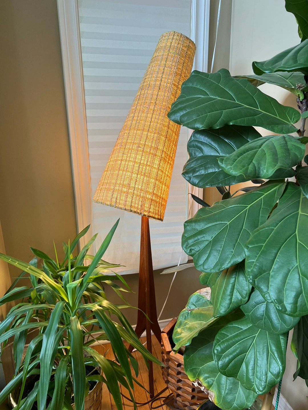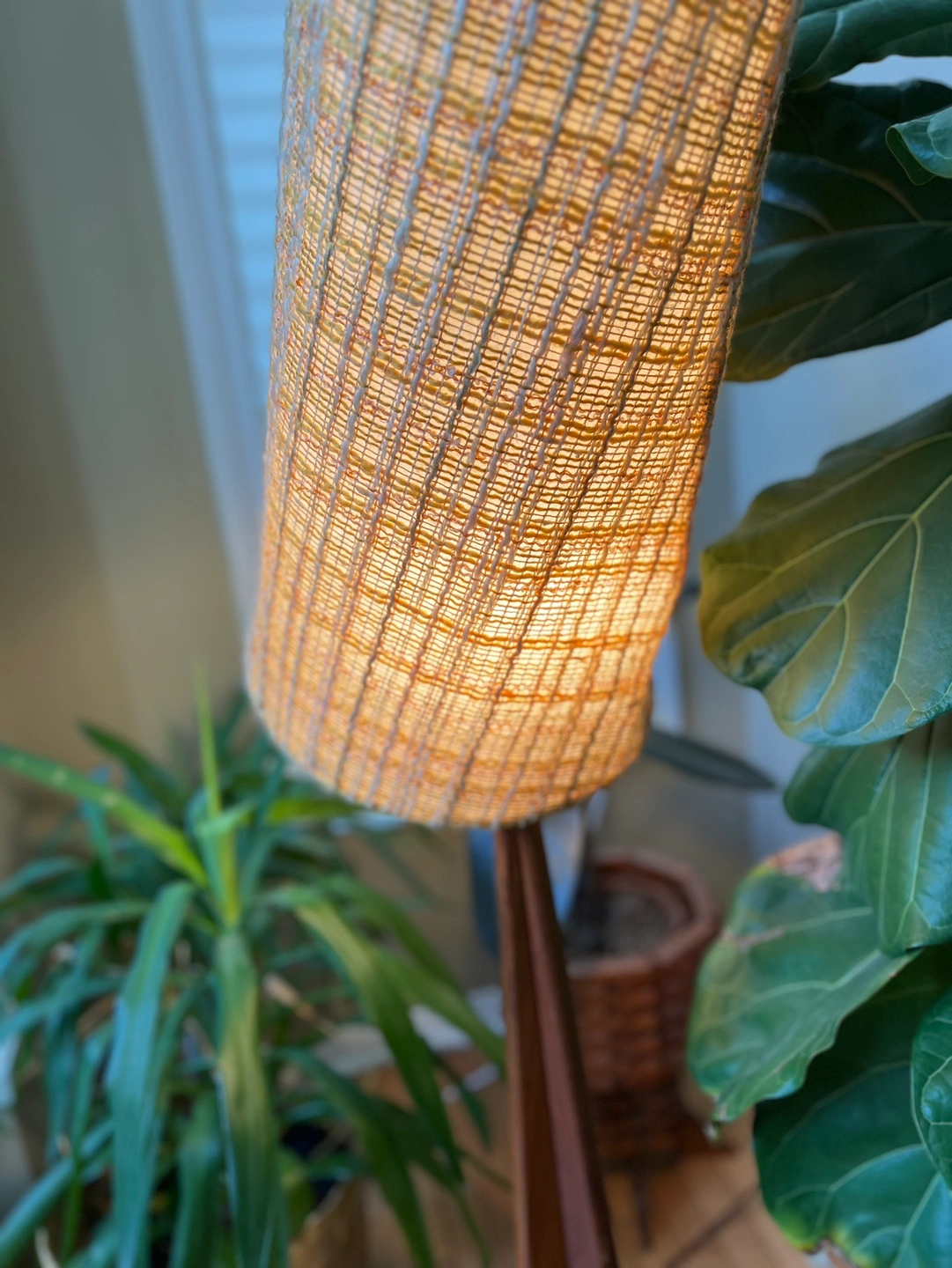 This is a vintage floor lamp with a wooden tripod base and a yellow fabric lampshade. The lamp has a brass socket and a black rotary switch. The lamp is in good condition with minimal signs of wear.