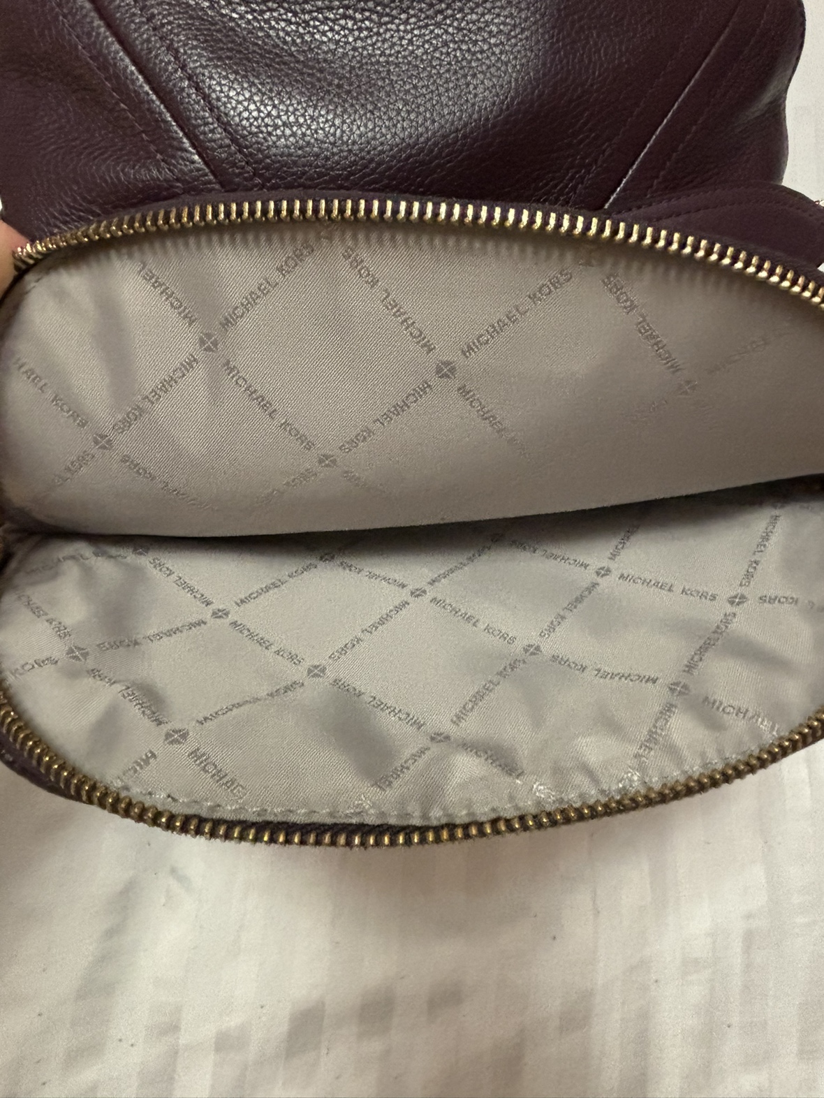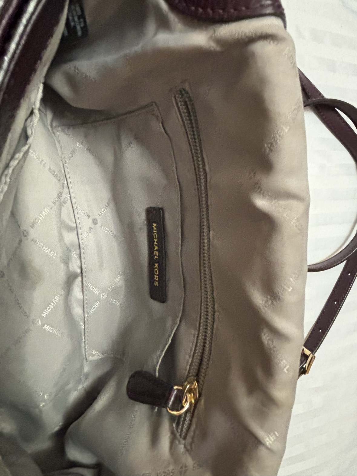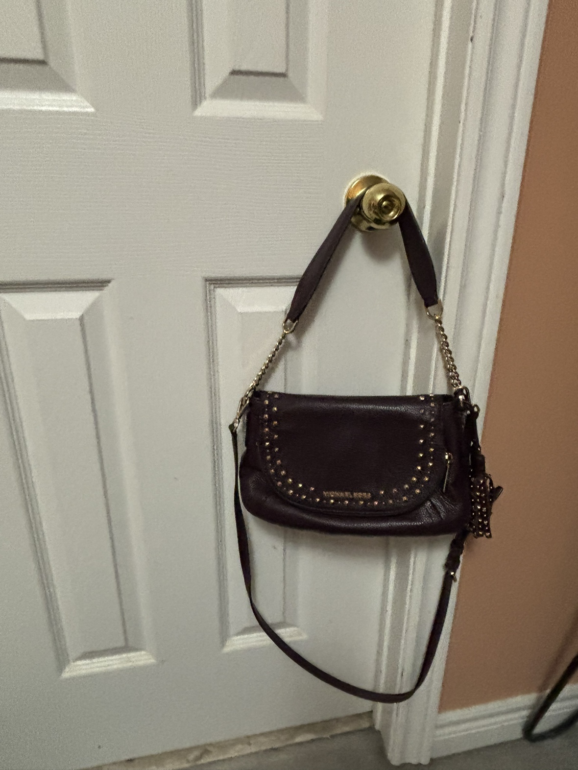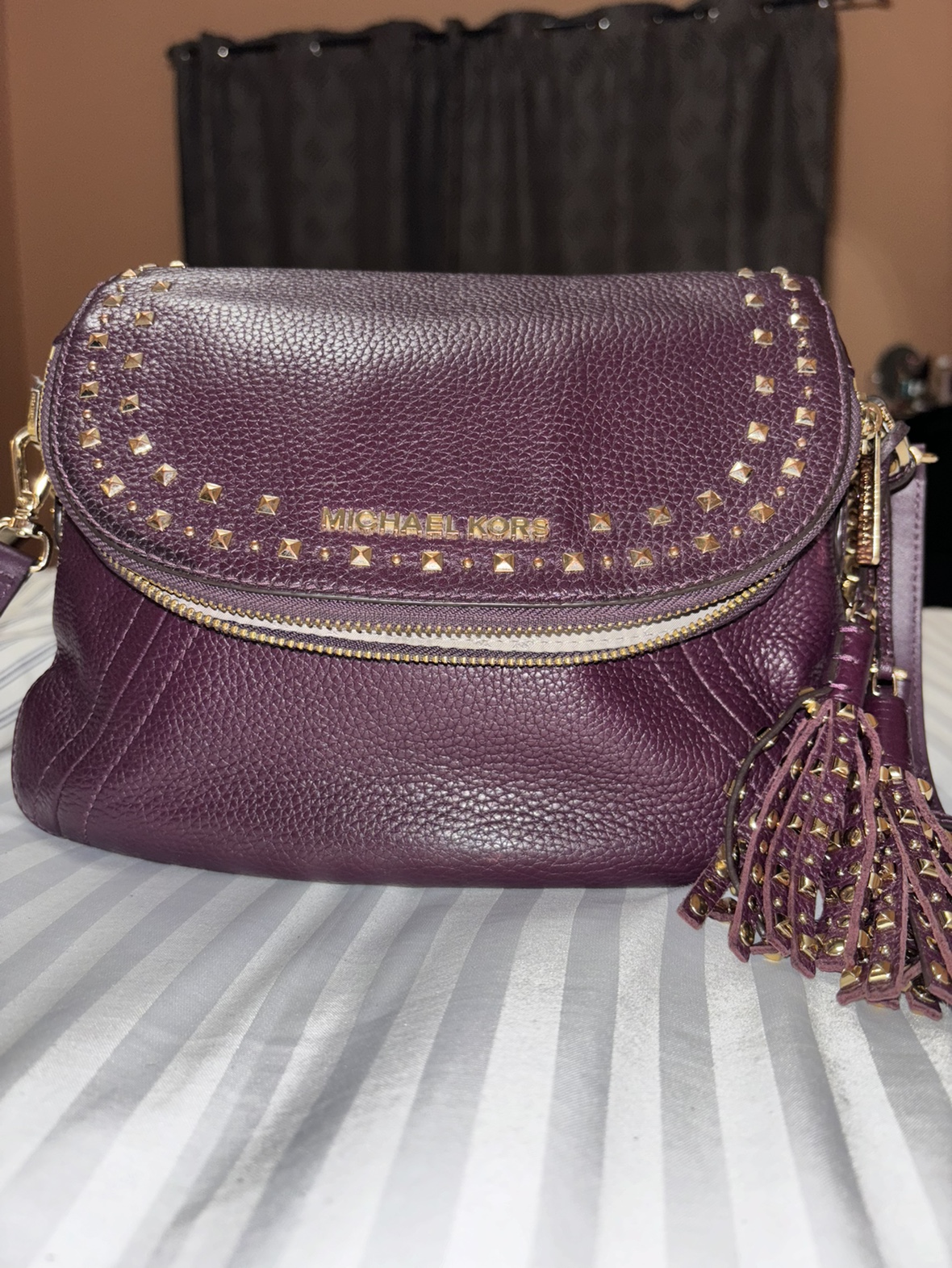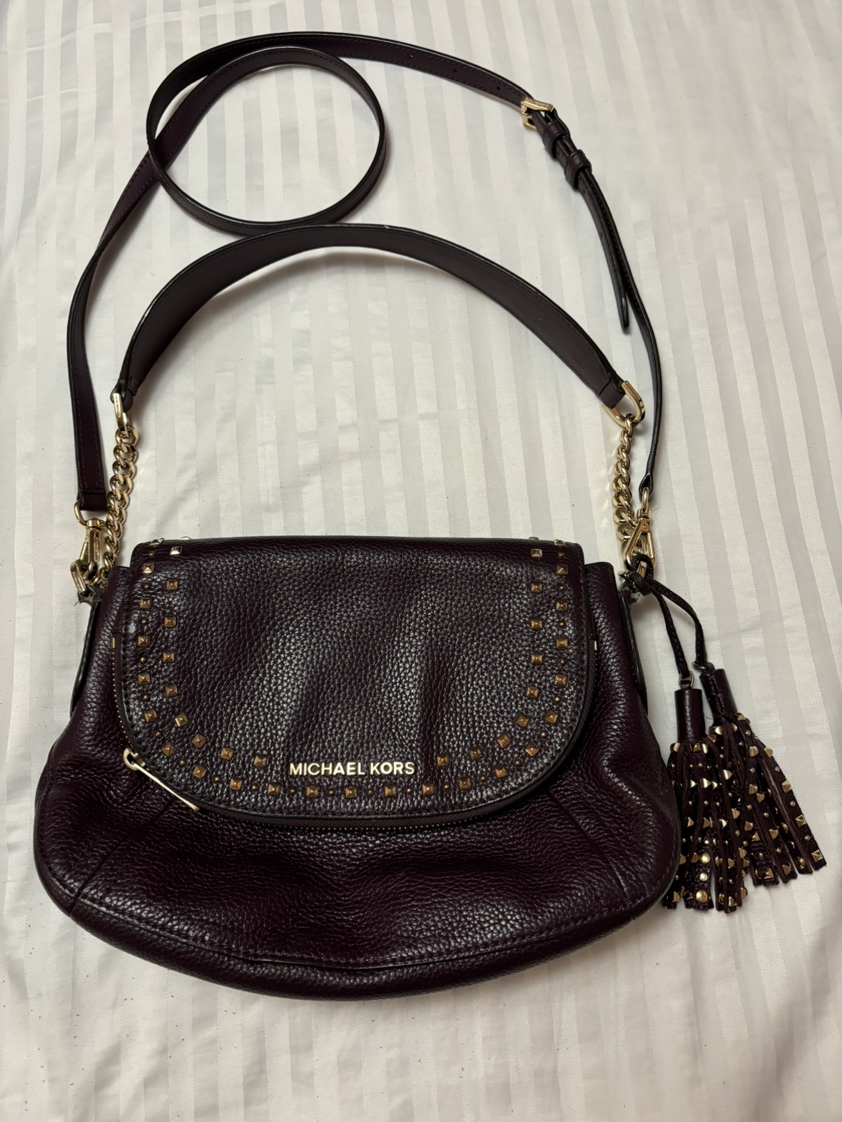 Burgundy leather crossbody bag with gold studs and a removable tassel. The strap is adjustable and can be worn as a crossbody or shoulder bag. The bag is in great condition.