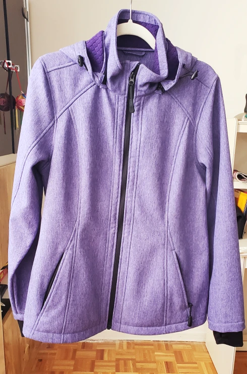 Women's size S to M, purple softshell jacket with a removable hood. The jacket has a zipper closure and two front pockets, as well as inner pockets. It is lined with a purple fleece fabric.