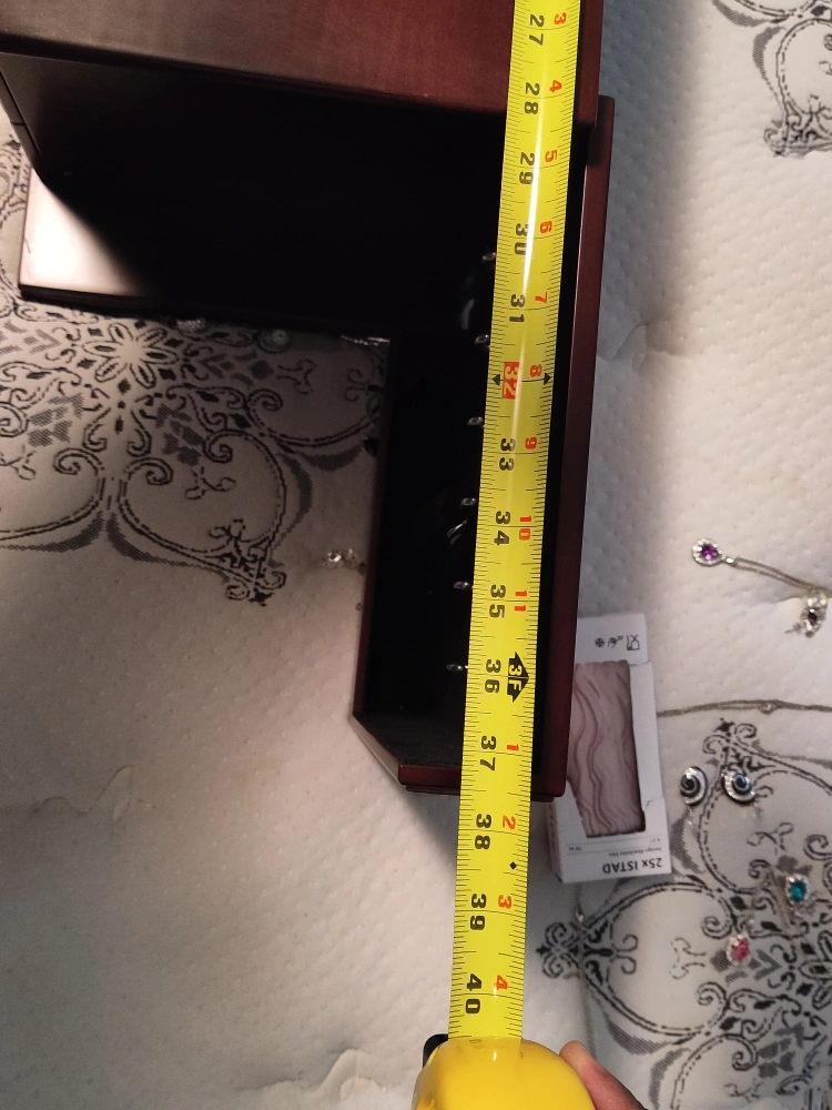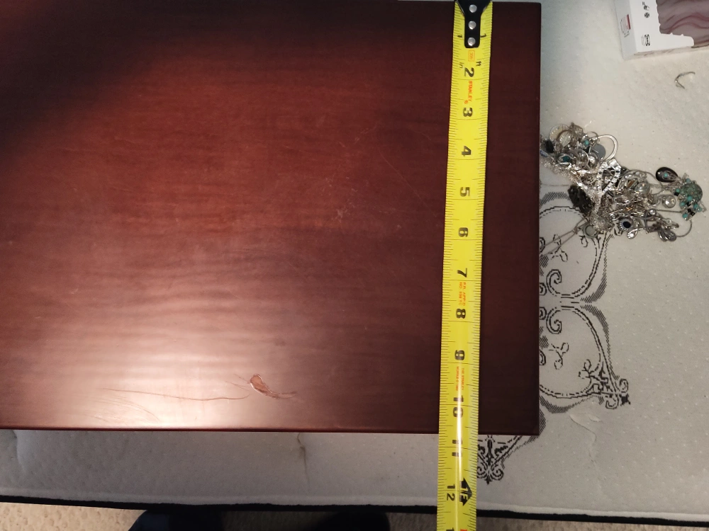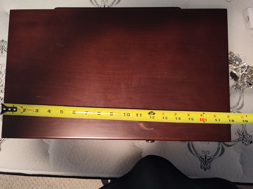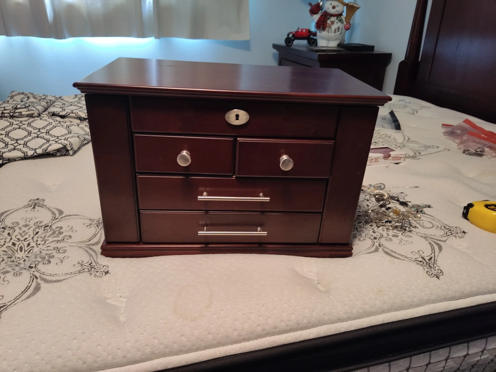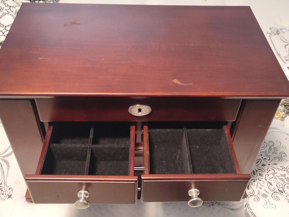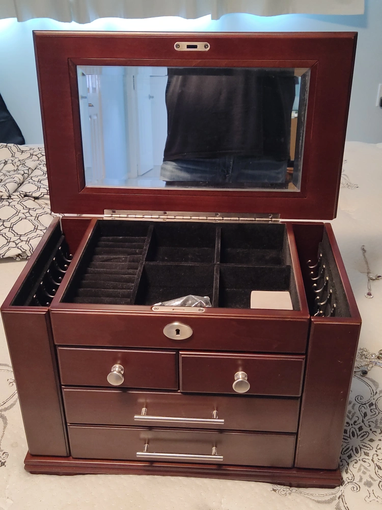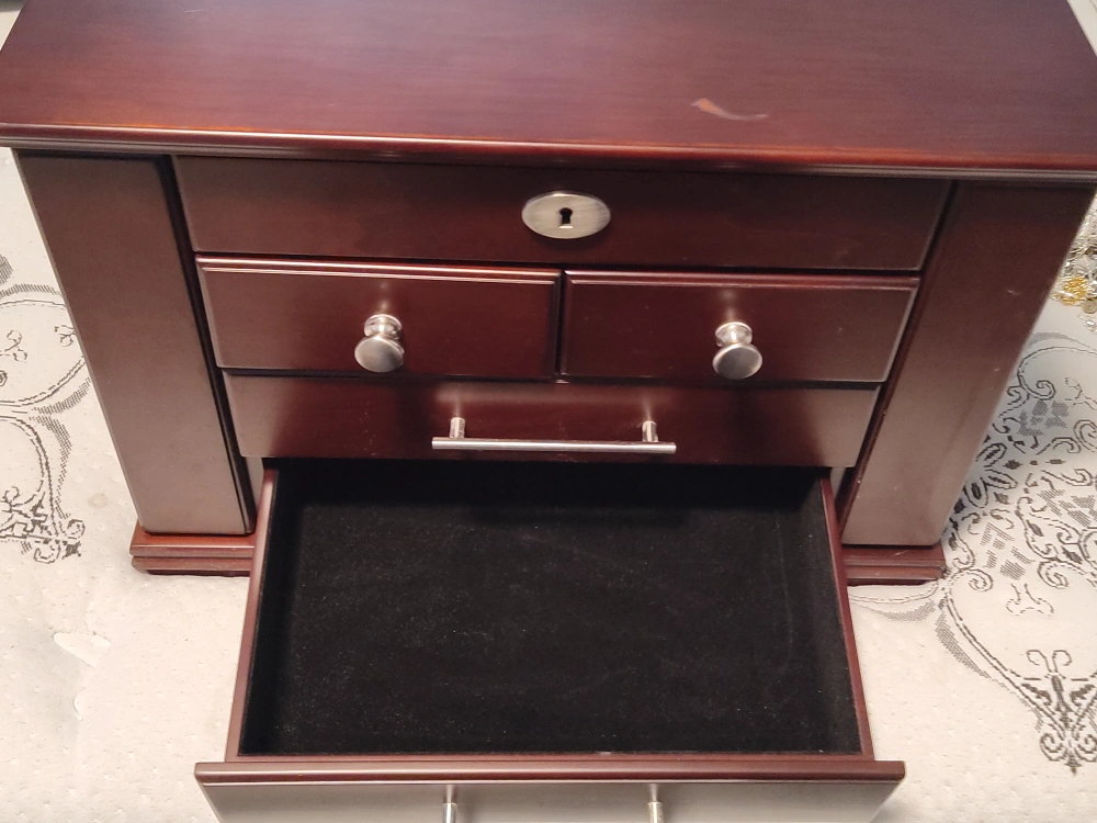 A wooden jewelry box with 4 drawers. It has a lock and key. The box is brown. The top opens to reveal a mirror and a section for rings. The box is approximately 18 inches wide, 10.5 inches deep, and 12 inches tall.