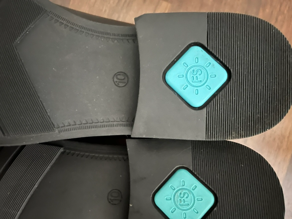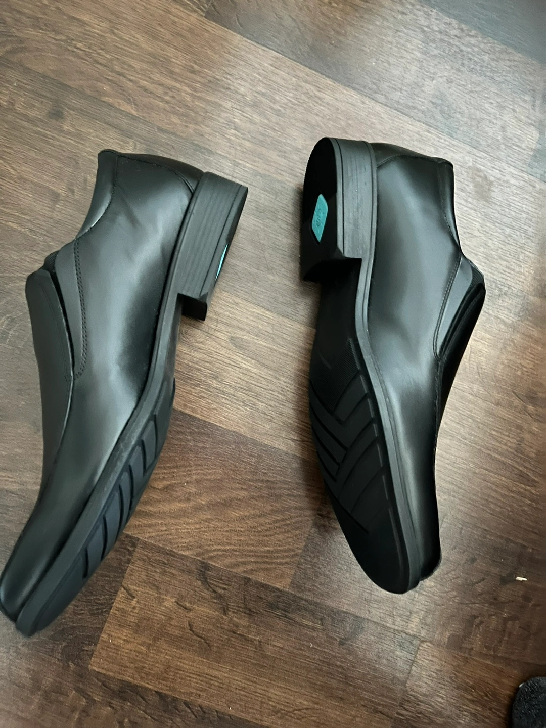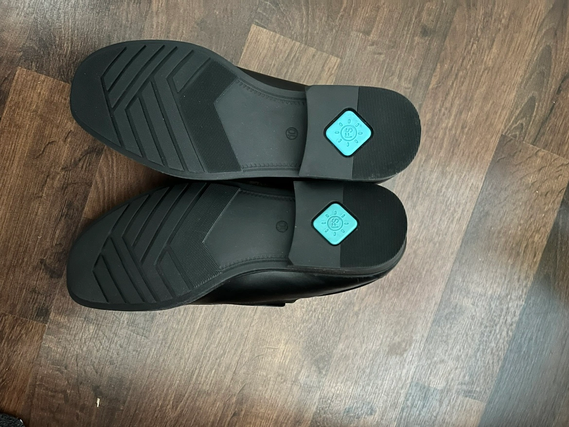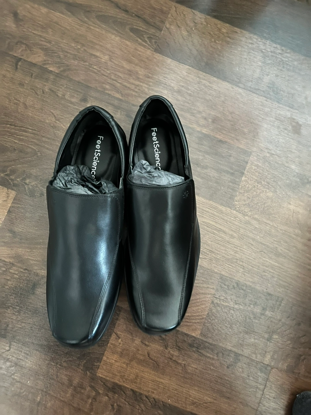 Black leather slip on shoes with FeetScience logo.
