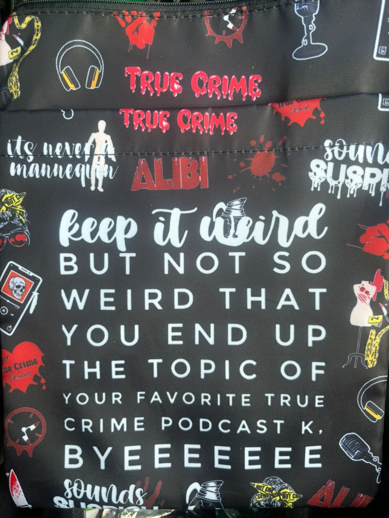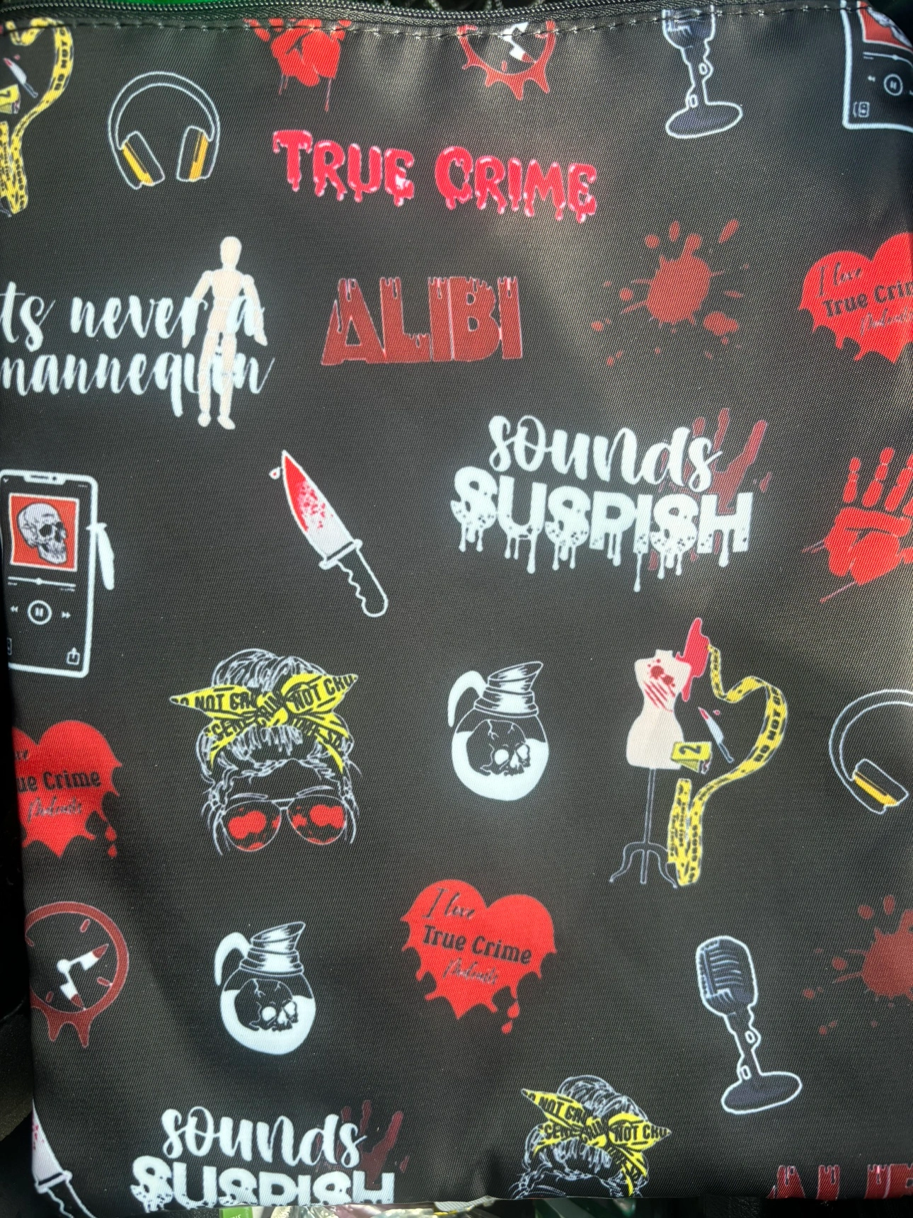 286Black bag with a variety of true crime themed designs. Printed in both sides