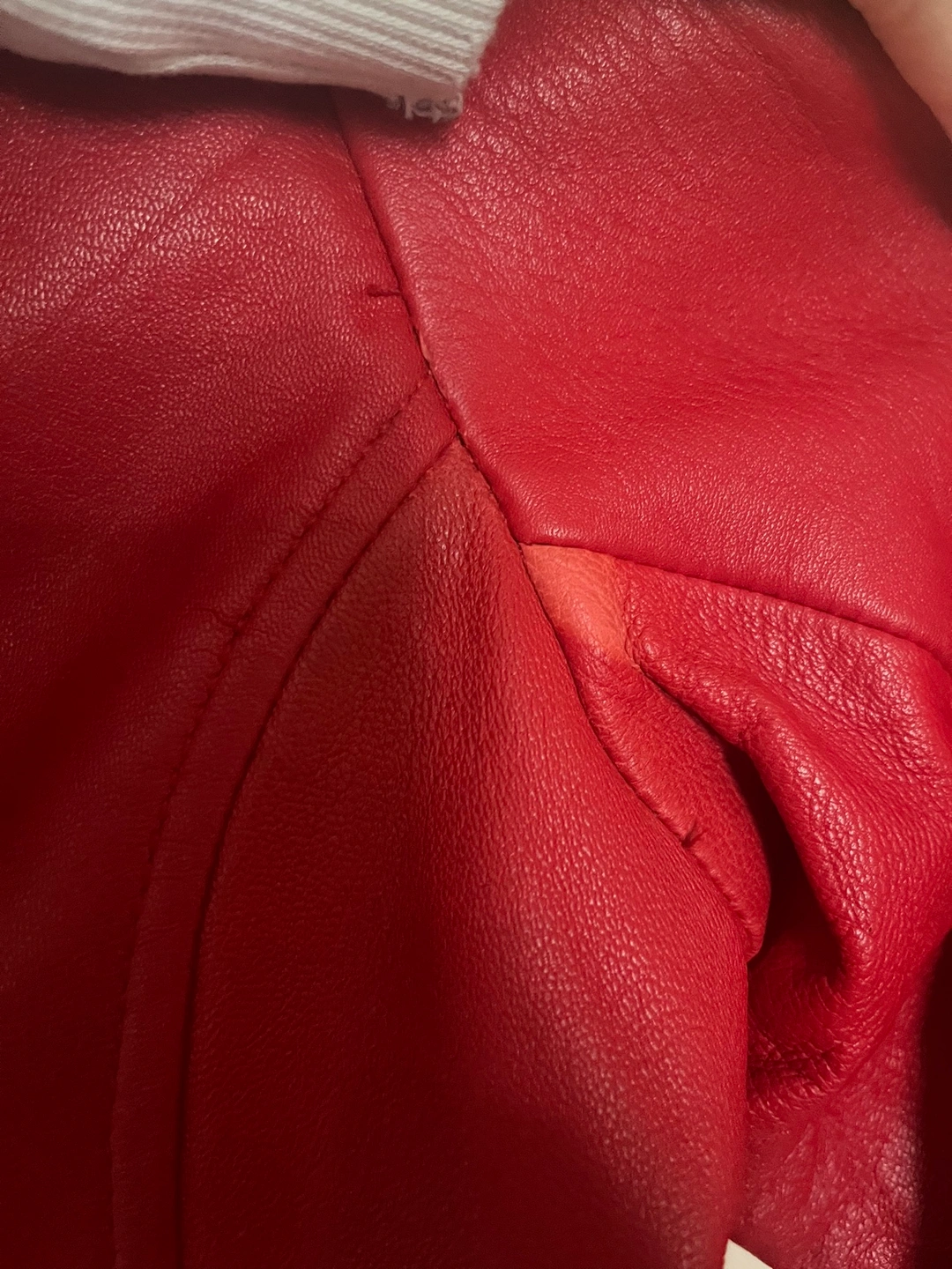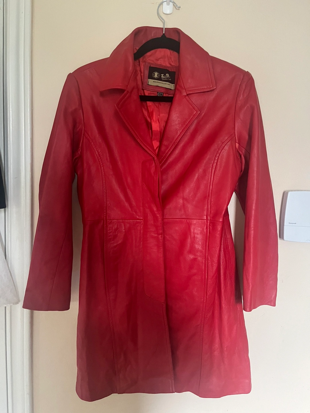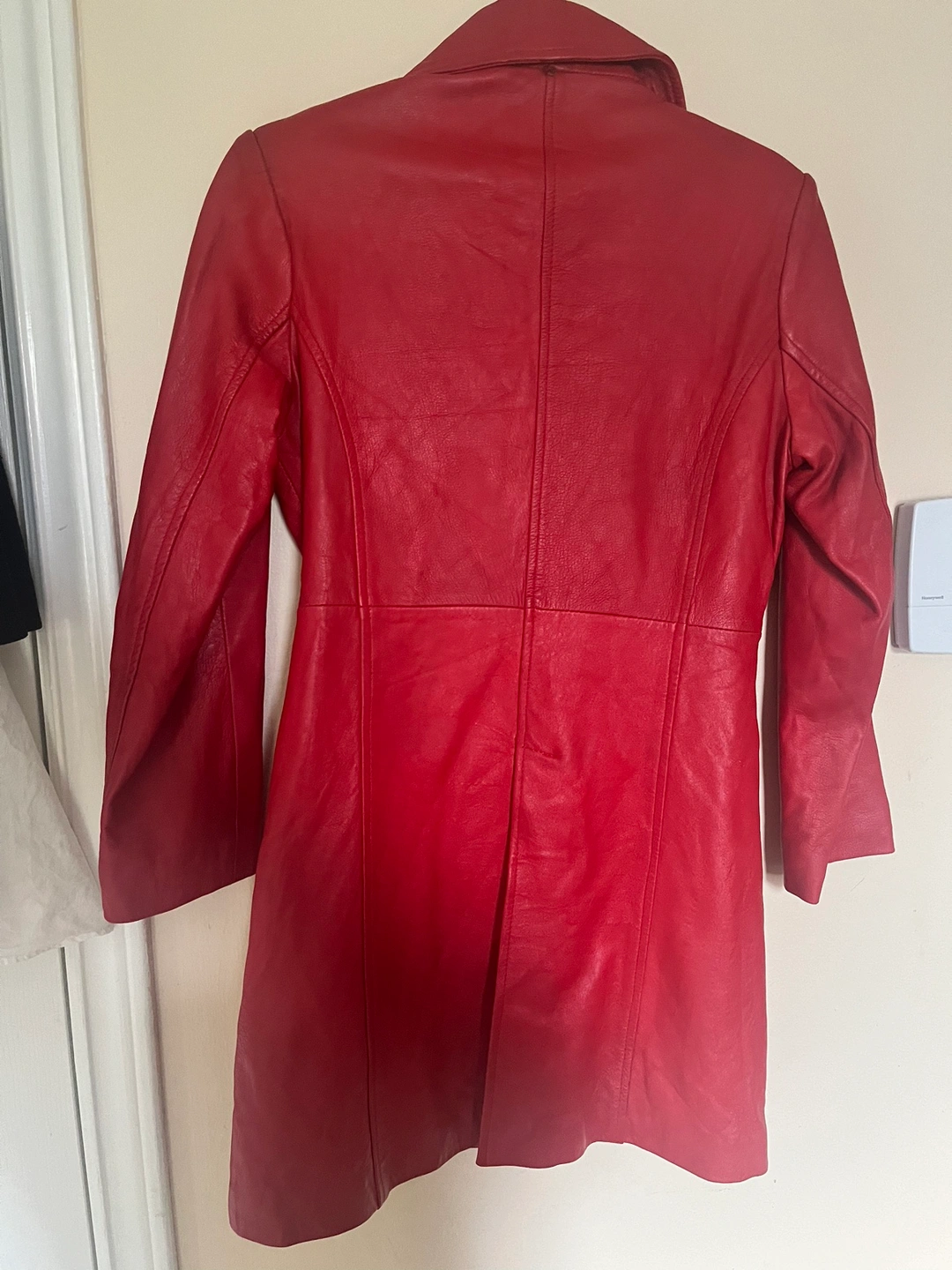 Bright cherry red genuine leather jacket with a double breasted front closure, classic moto collar and buttons. Two front pockets and one inner pocket. Length approx. 29inch